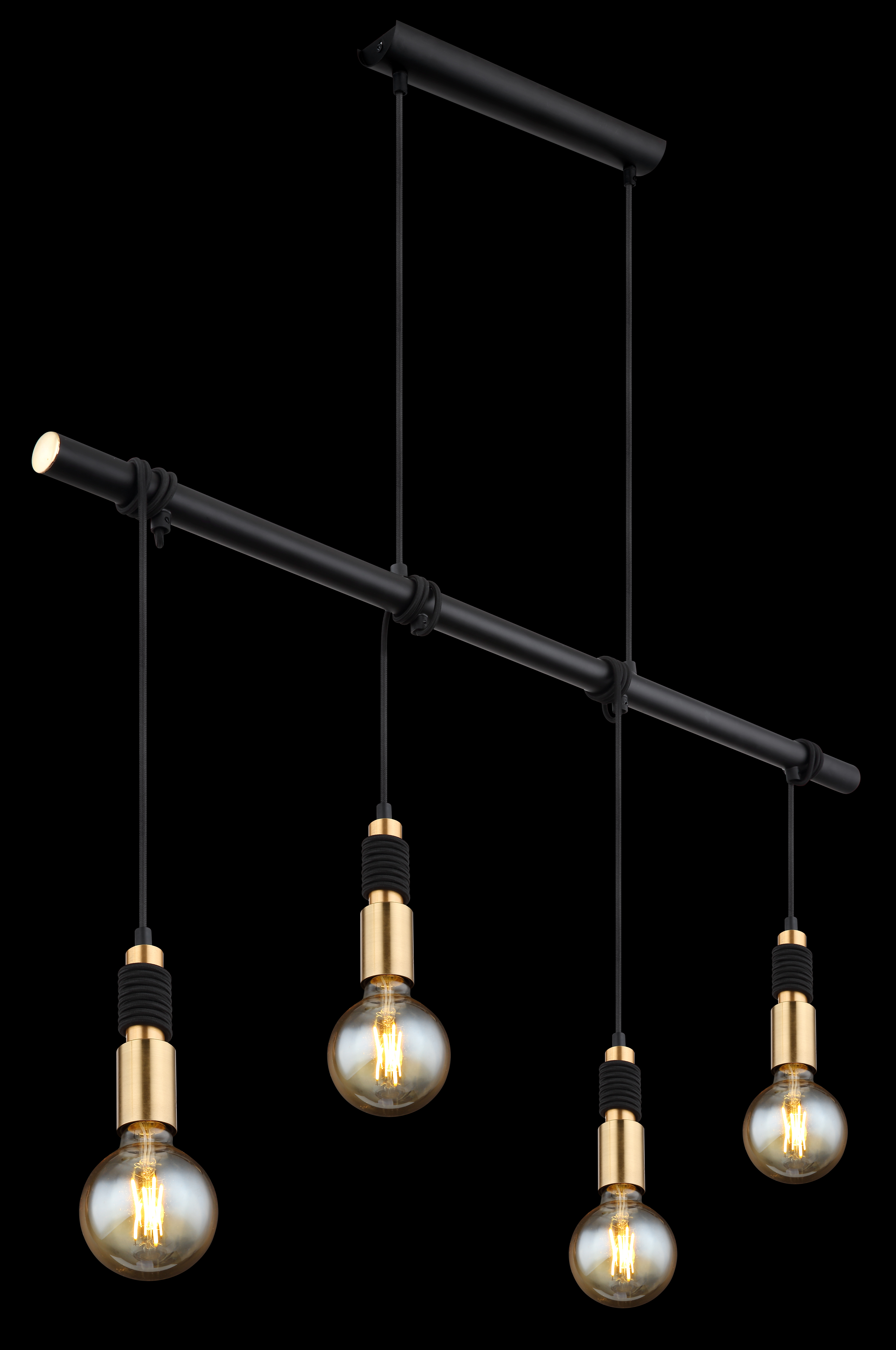 Questa moderna sospensione della serie Alexius è una meravigliosa aggiunta a qualunque ambiente. La sospensione lunga 100 cm consiste in un'asta di metallo nero opaco che pende dal soffitto su due cavi. È anche avvolto da quattro cavi neri, che sono dotati di prese E27 incorniciate da ottone. Si possono equipaggiare con lampadine abbinate di propria scelta, il che dà la possibilità di determinare individualmente il colore della luce e la luminosità. Inoltre, l'altezza della lampada può essere regolata fino a 120 cm. Con altri modelli della stessa serie, si può completare il quadro generale all'interno dell'ambiente.