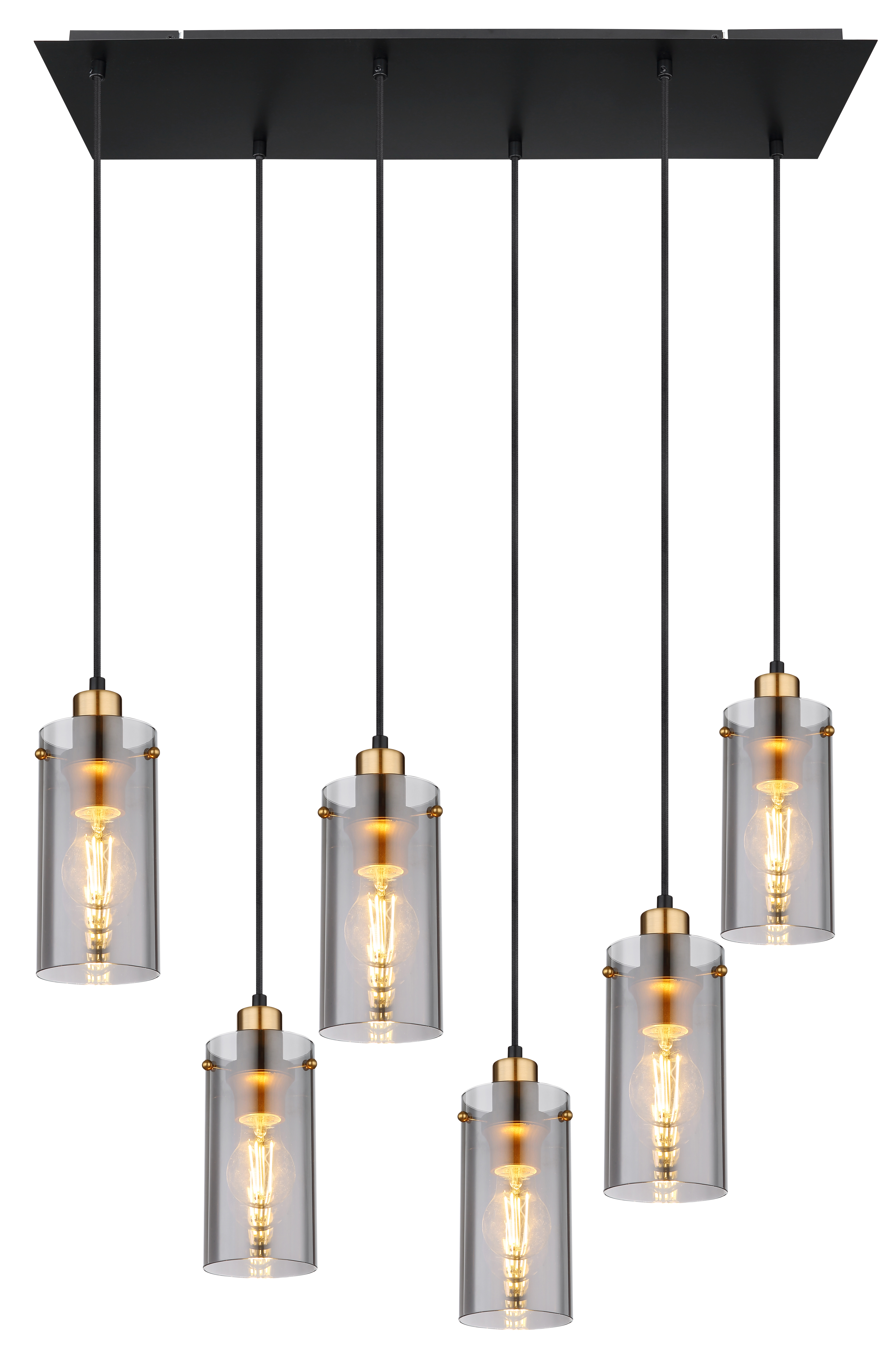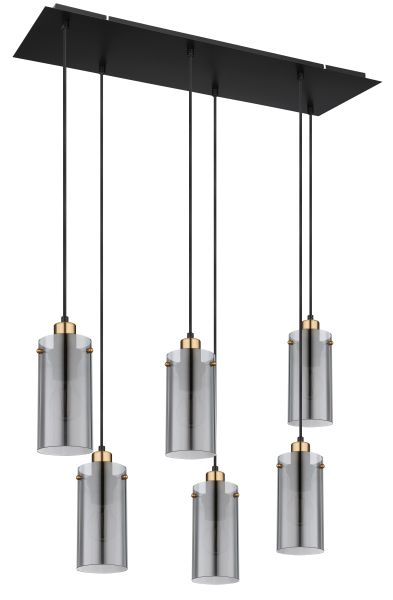 Questa bella sospensione della serie Fanni combina un design semplice e moderno. È composta da sei prese E27, ognuna con un paralume cilindrico (Ø10 cm) nei colori fumé con decorazioni in ottone, che si appendono a cavi neri su un attacco a soffitto rettangolare (75x24 cm) fino a 1,2 m dal soffitto. Gli attacchi E27 consentono di scegliere liberamente le lampadine da utilizzare, fino a una potenza massima di 40 watt. Con altri modelli di questa serie potrete abbellire la vostra zona giorno.