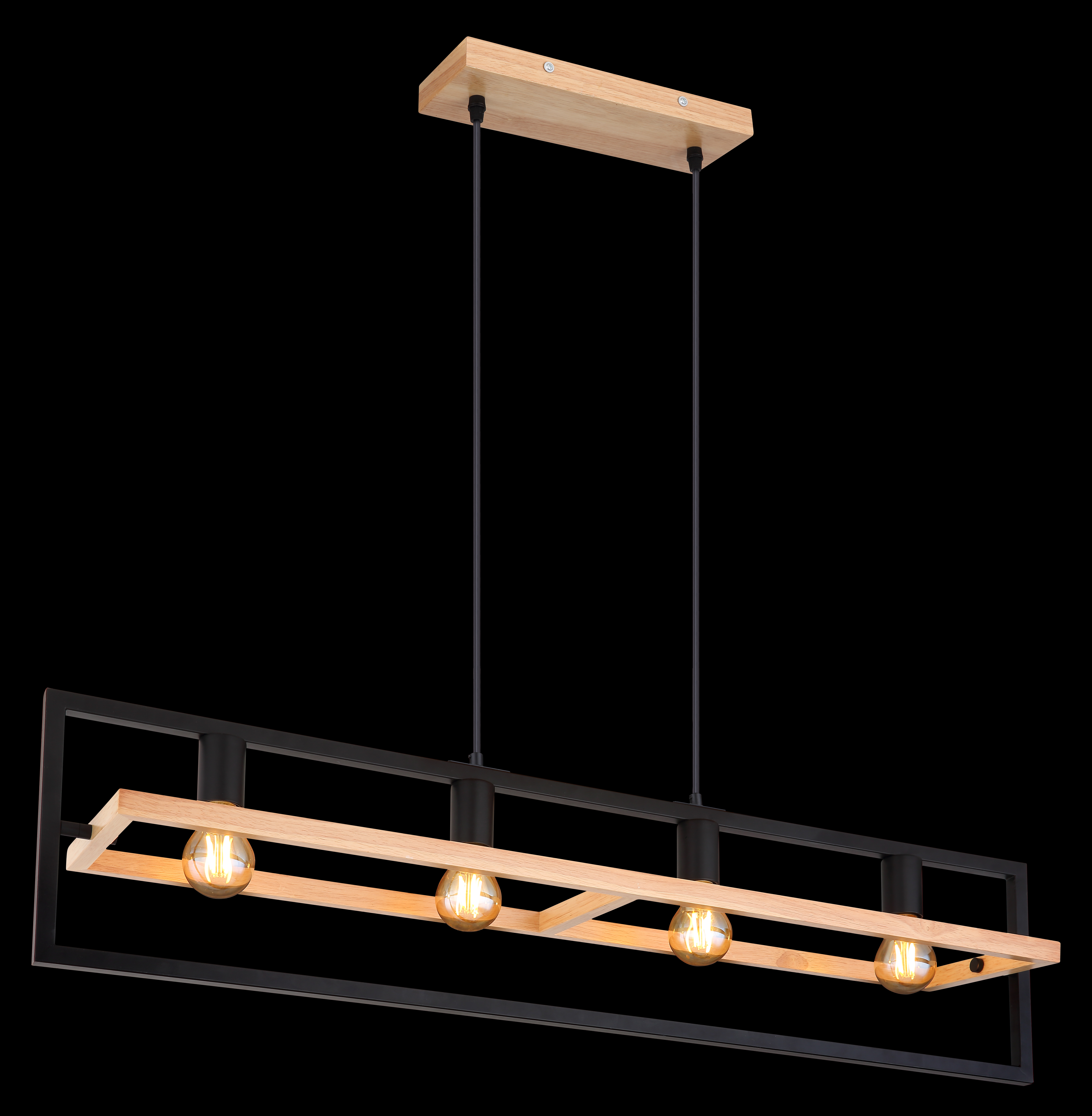 Questa plafoniera estremamente moderna della serie Erica ispira per il suo grande design. È costituita da una struttura rettangolare in metallo nero opaco di 98 cm di lunghezza su cui si trovano quattro prese E27 ed è circondata da un altro rettangolo mobile in legno di 20 cm di larghezza. Da una staffa rettangolare in legno, la lampada pende su due aste metalliche a 1,5 m dal soffitto. Gli attacchi E27 permettono di scegliere liberamente lampadine fino a una potenza massima di 40 watt.