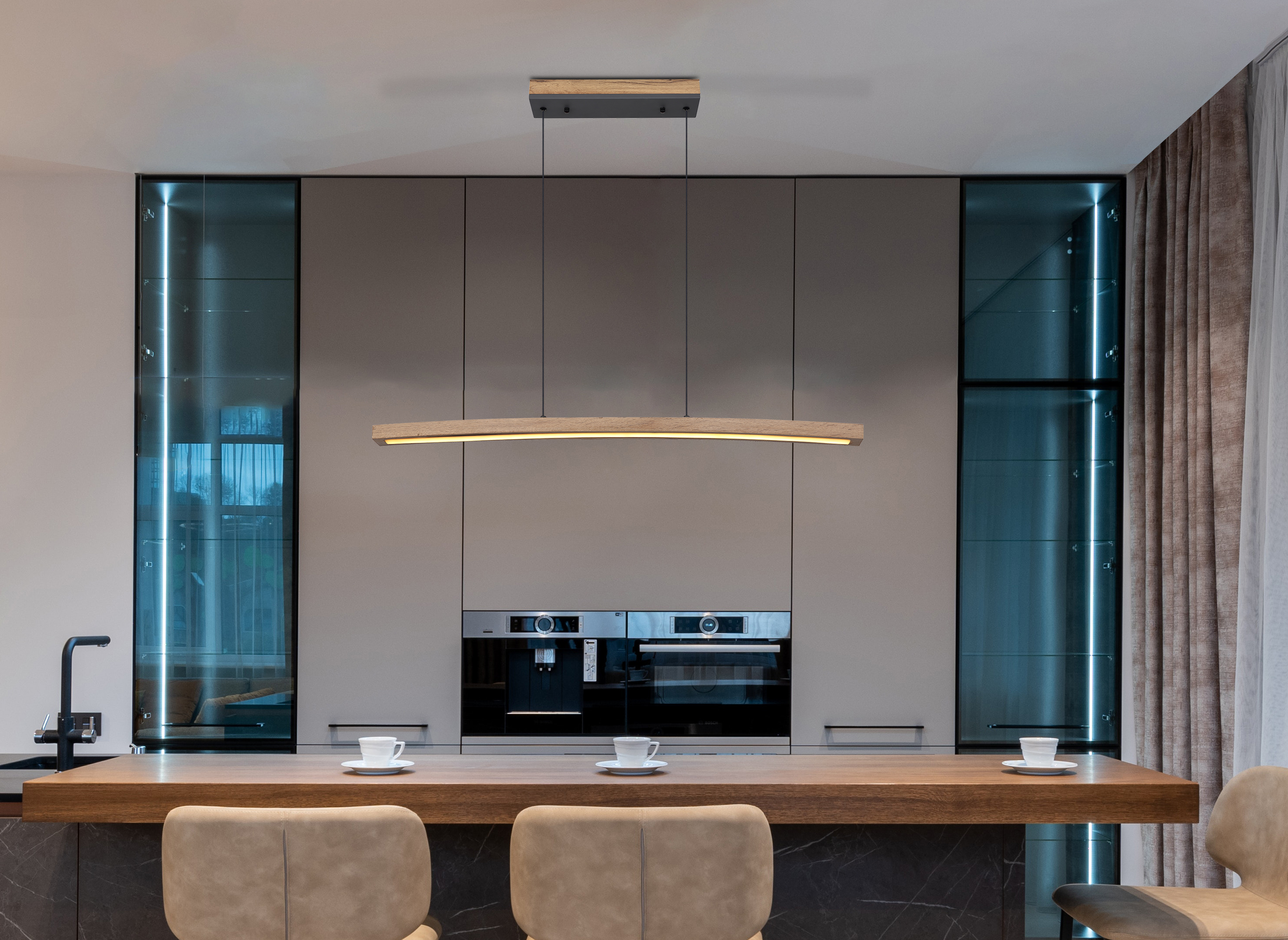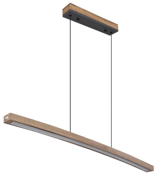 Questa formosa sospensione della serie Doro ispira giovani e meno giovani. Da un attacco a soffitto rettangolare in un fantastico effetto legno, due cavi lunghi 1,2 m passano a un'asta in MDF curva lunga 1 m in effetto legno con pannello LED integrato. Questo fornisce una luce bianca calda da 3000 Kelvin e garantisce così un'atmosfera piacevole. L'apparecchio può essere azionato tramite Touch ON/OFF e anche dimmerato con il tocco.