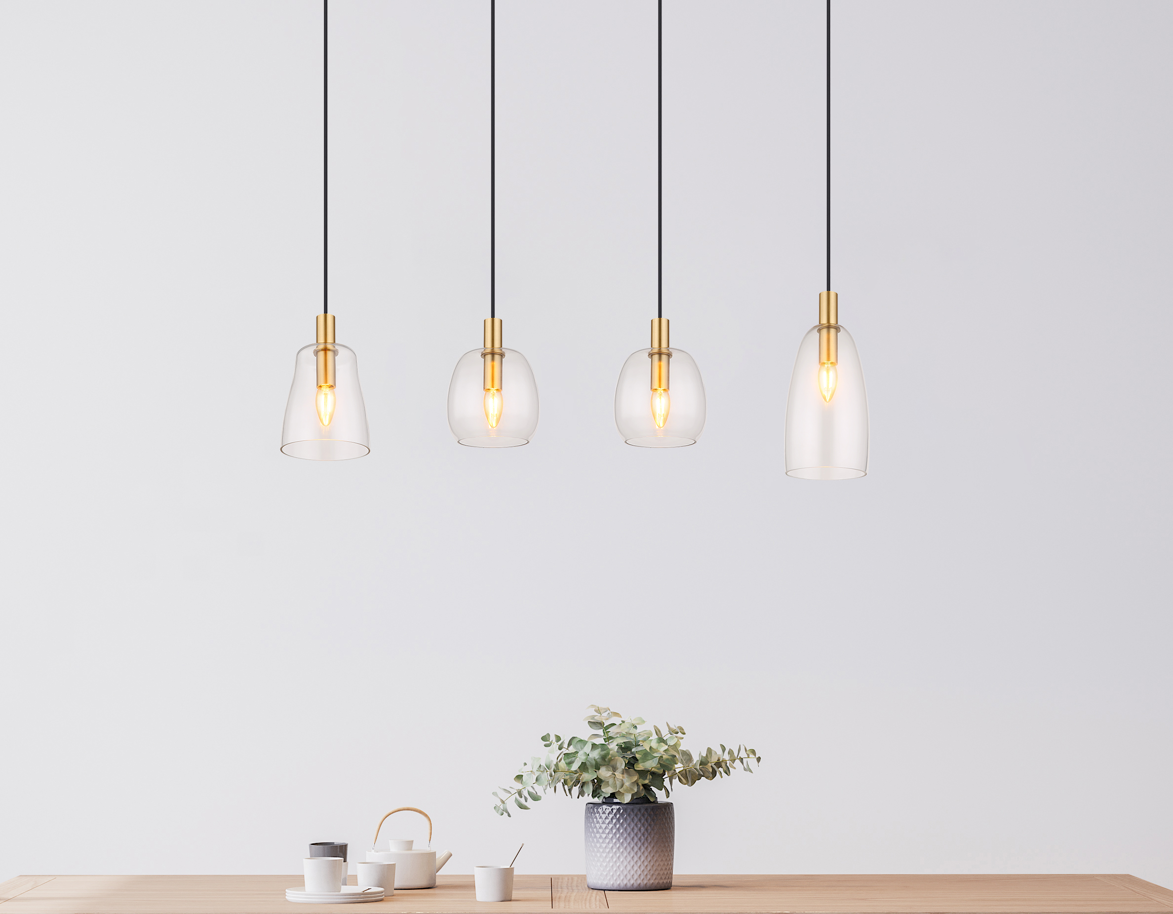 Questa elegante sospensione ispira con il suo bel design. Su un supporto a soffitto lungo 107 cm passano quattro cavi neri di 1,2 m di lunghezza, ciascuno con una presa E14, dotati di paralumi in vetro di diverse forme e decorazioni in ottone. Gli attacchi E14 consentono di determinare il colore e la luminosità della luce fino a una potenza massima di 40 watt. Per la longevità e il risparmio energetico, si consigliano le lampadine a LED.
