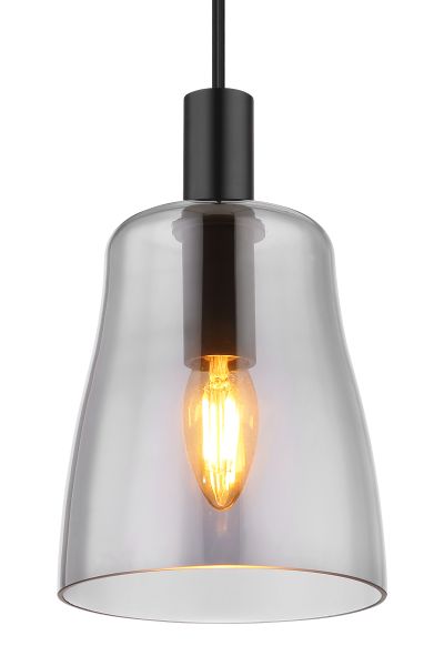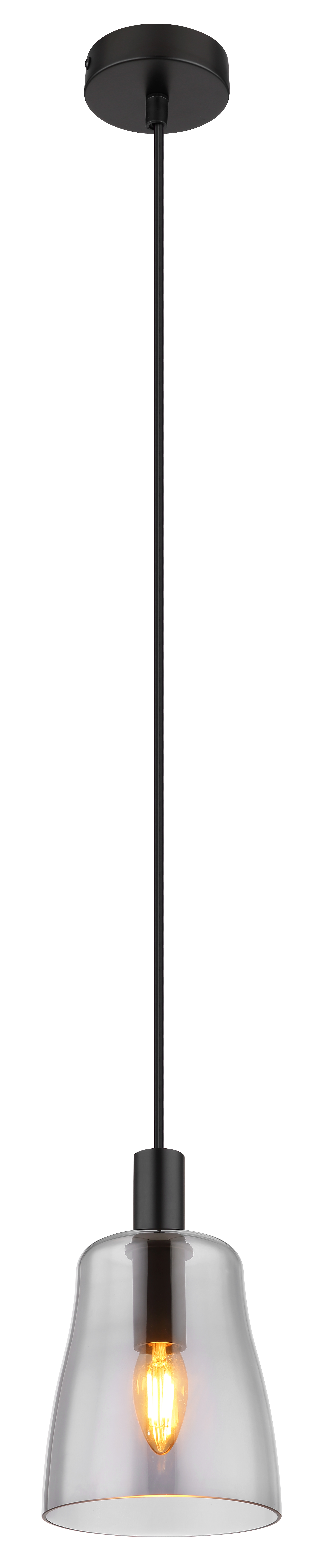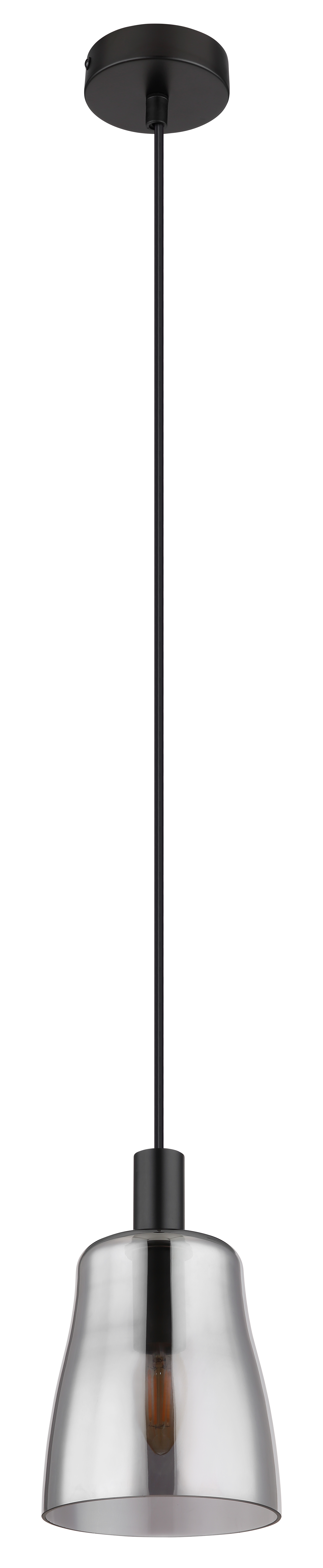 Questa elegante sospensione ispira con il suo bel design. Da un attacco a soffitto rotondo, un cavo nero lungo 1,2 m sporge verso una presa E14, dotata di un paralume in vetro color fumé (Ø 14,5 cm) e di decorazioni in nero. La presa E14 consente di determinare il proprio colore di luce e la luminosità fino a una potenza massima di 40 watt. Per la longevità e il risparmio energetico, si consigliano le lampadine a LED.