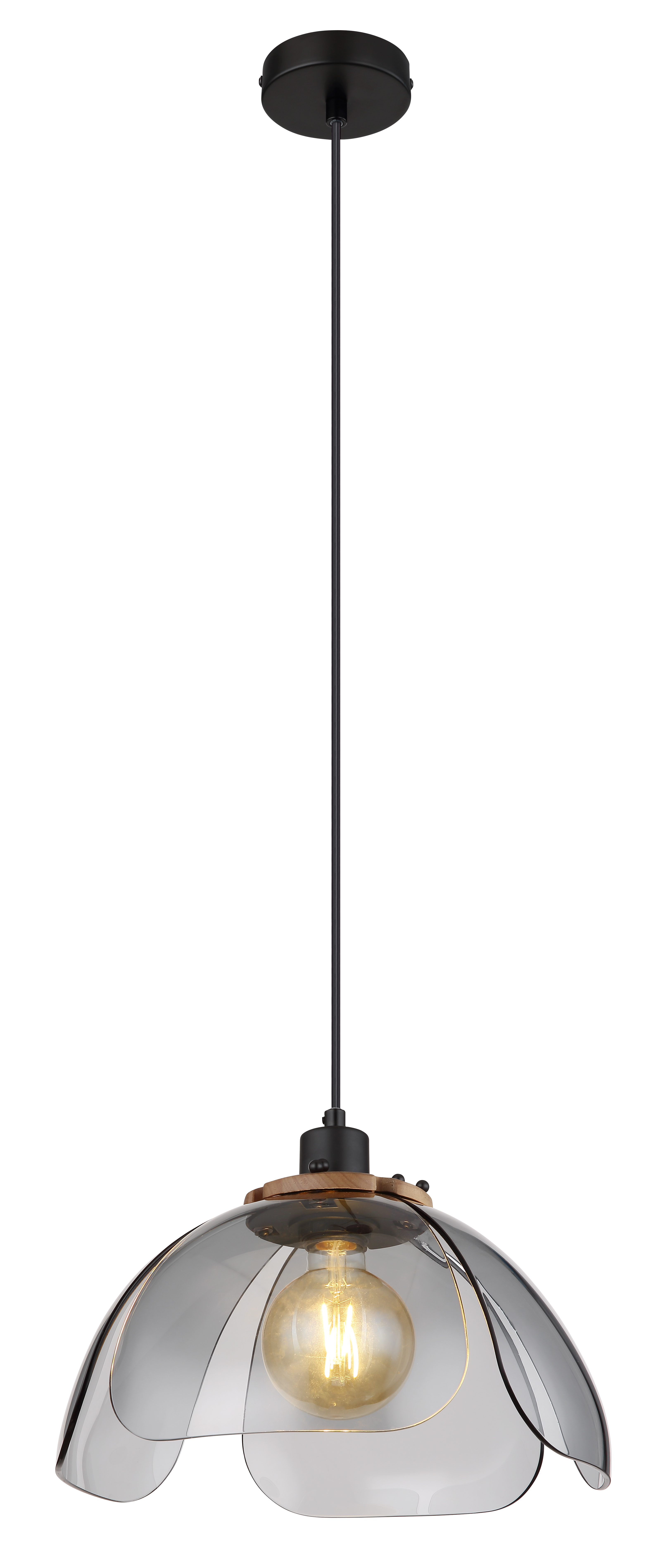 Questa bellissima sospensione convince per il suo design. Un cavo lungo 1,2 m sporge da una base rotonda, sulla quale si trova una presa E27 con un paralume in vetro color fumé a forma di fiore. L'attacco E27 consente di scegliere liberamente, fino a una potenza massima di 40 watt, il colore e la luminosità della luce. Per la longevità e il risparmio energetico, si consigliano le lampadine a LED.