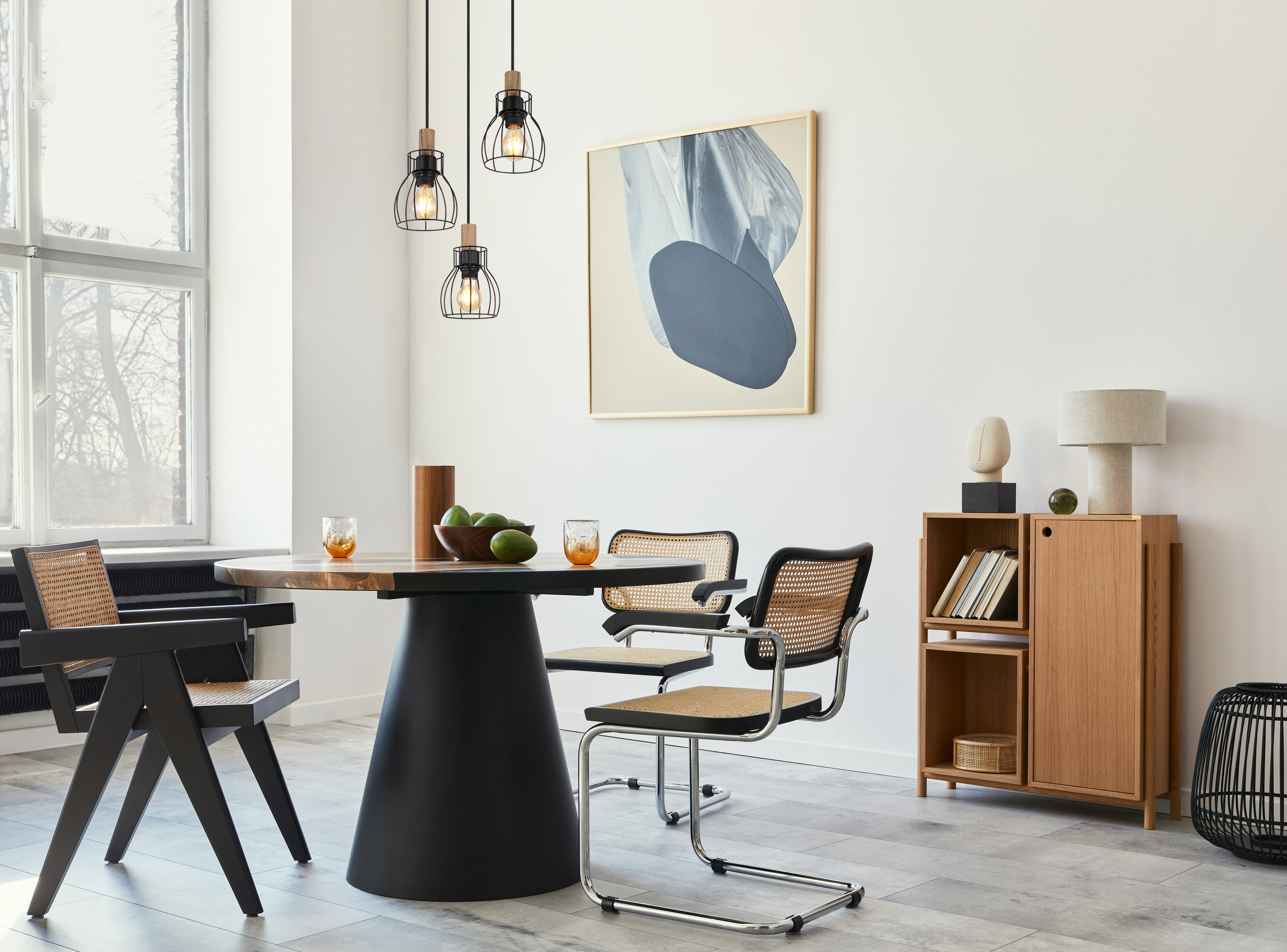 This great pendant lamp inspires with a beautiful design. Three black cables in different lengths of up to 1.2 m protrude from a round black ceiling mount (Ø 25 cm) and end at an E27 socket with shapely shades made of metal rods (Ø 14 cm). The E27 sockets allow you to determine your own light color and brightness up to a maximum power of 40 watts. Due to longevity and power savings, we recommend LED bulbs.