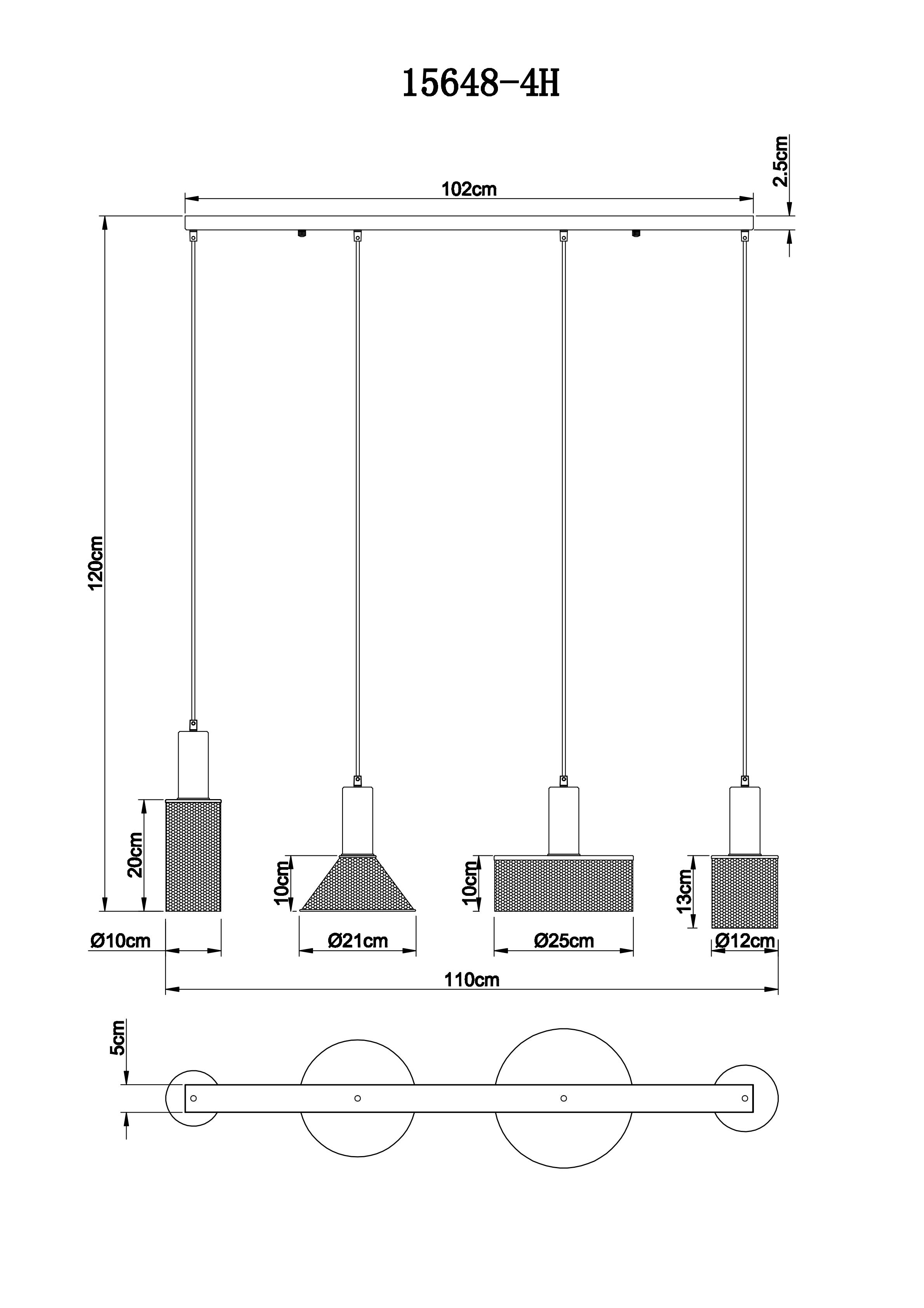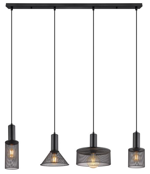 Questa grande lampada a sospensione della serie JEDD ispira con un design elegante. Quattro cavi lunghi 1,2 m sporgono da un supporto a soffitto nero lungo 105 cm, ciascuno con una presa E27. Questi sono tutti dotati di diverse tonalità formose realizzate in rete metallica nera. Le prese E27 consentono di determinare autonomamente il colore della luce e la luminosità fino a una potenza massima di 60 watt. A causa della longevità e del risparmio energetico, consigliamo le lampadine a LED.