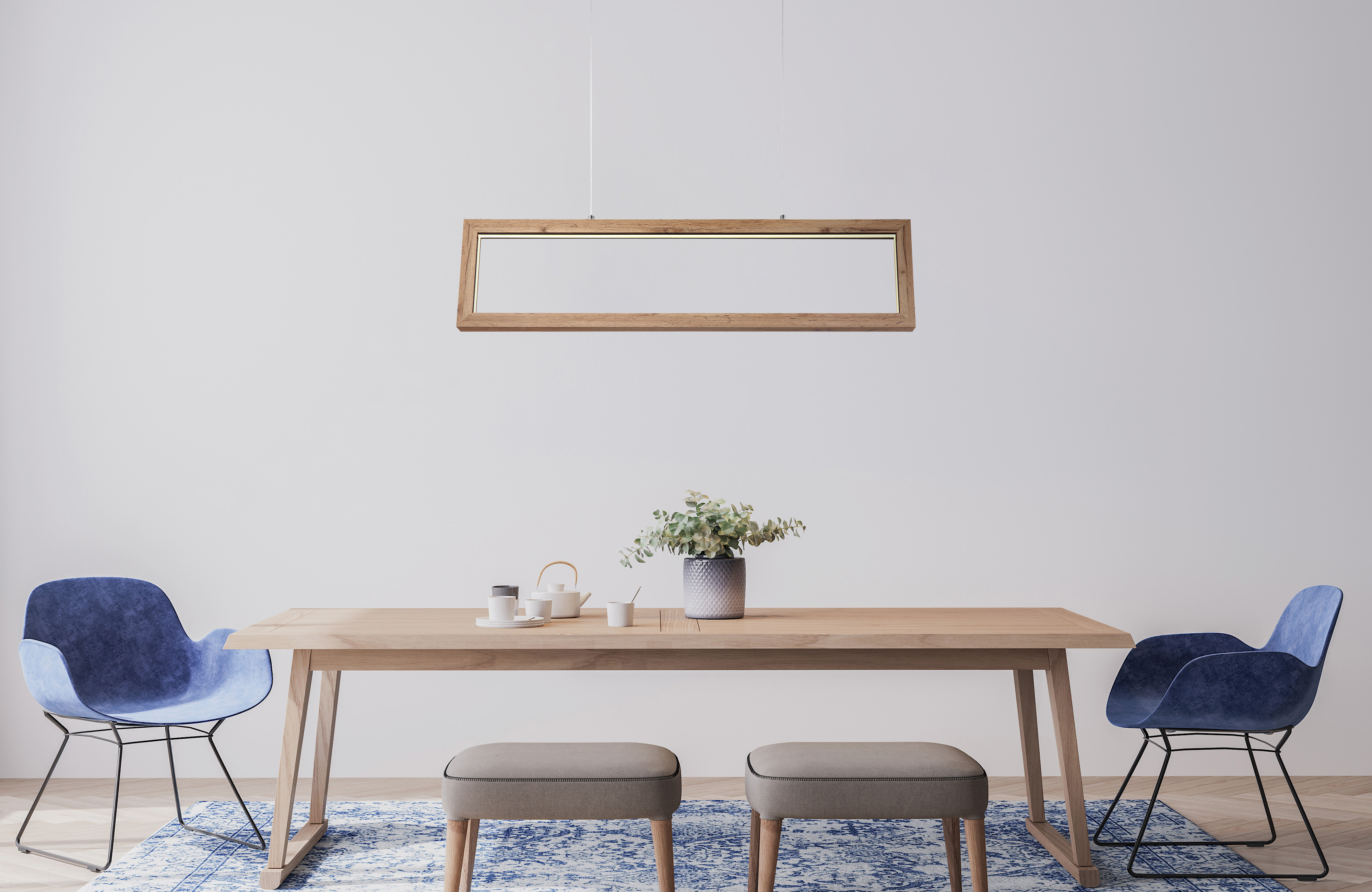 Questa grande lampada a sospensione ispira con un design moderno. Da un montaggio a soffitto lungo 80 cm, due cavi lunghi 1,2 m corrono a una cornice in effetto legno con LED integrati, che emettono una luce bianca calda da 3000 Kelvin e offrono così un'atmosfera piacevole.