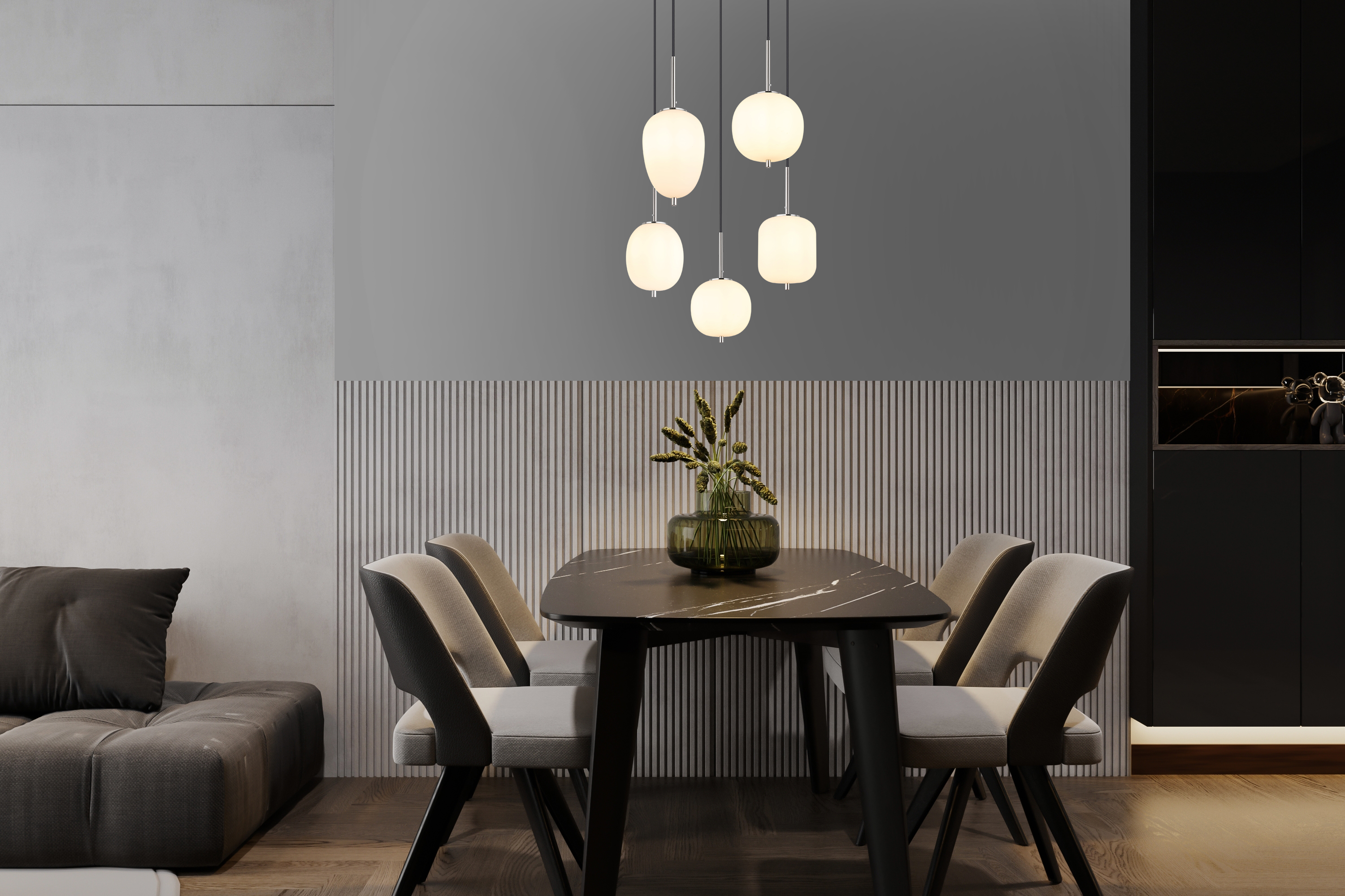 La formosa lampada a sospensione della serie Blacky I ispira grandi e piccini. Da un fissaggio rotondo a soffitto color nichel, 5 cavi corrono fino a 1,5 m dal soffitto e ciascuna estremità a una presa E14. Le prese E14 hanno ciascuna una tonalità opalina in forme diverse e forniscono un'ottima immagine generale. Le prese E14 consentono di determinare autonomamente il colore della luce e la luminosità fino a una potenza massima di 40 watt. Imposta nuovi accenti nei tuoi locali.
