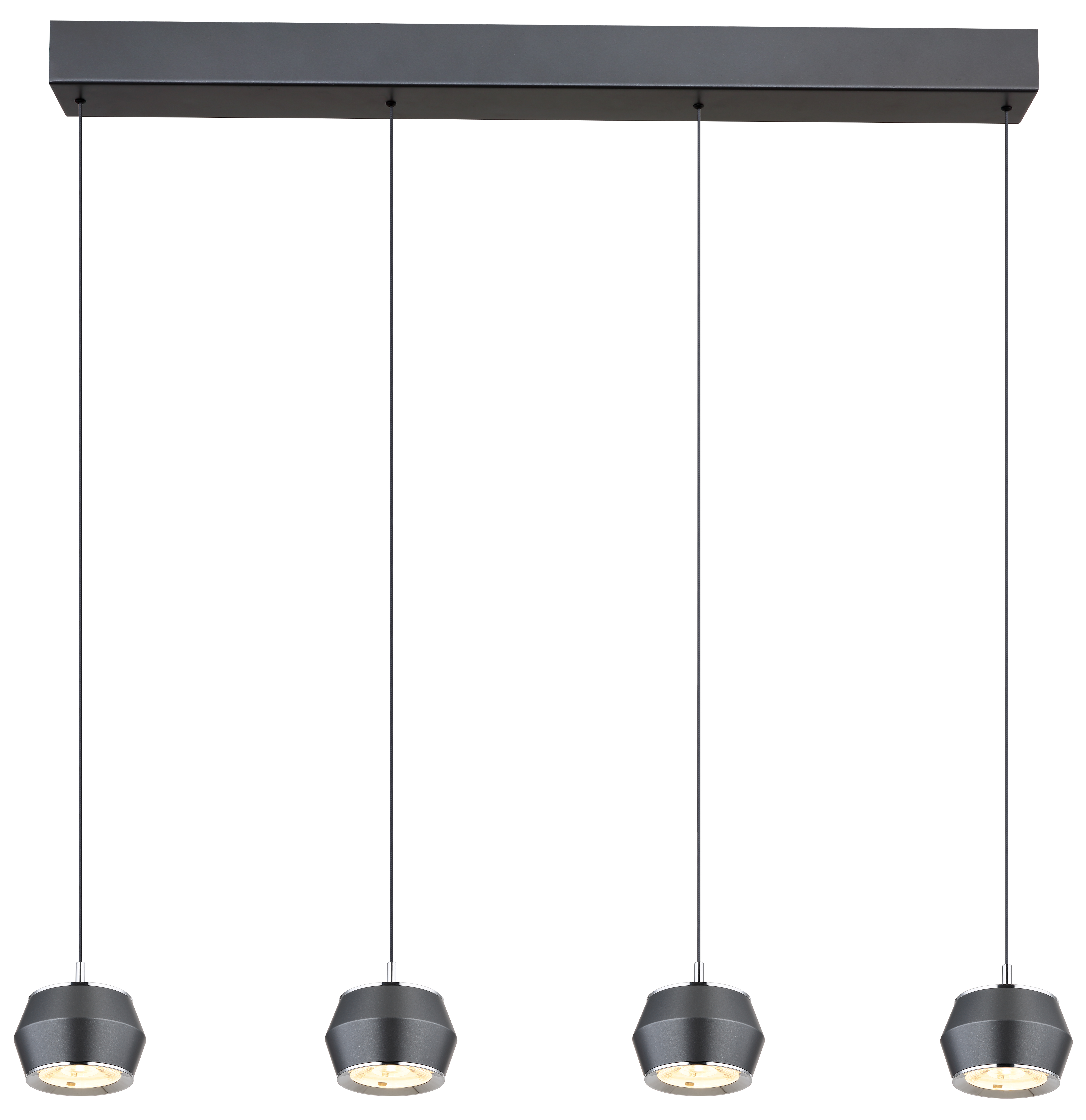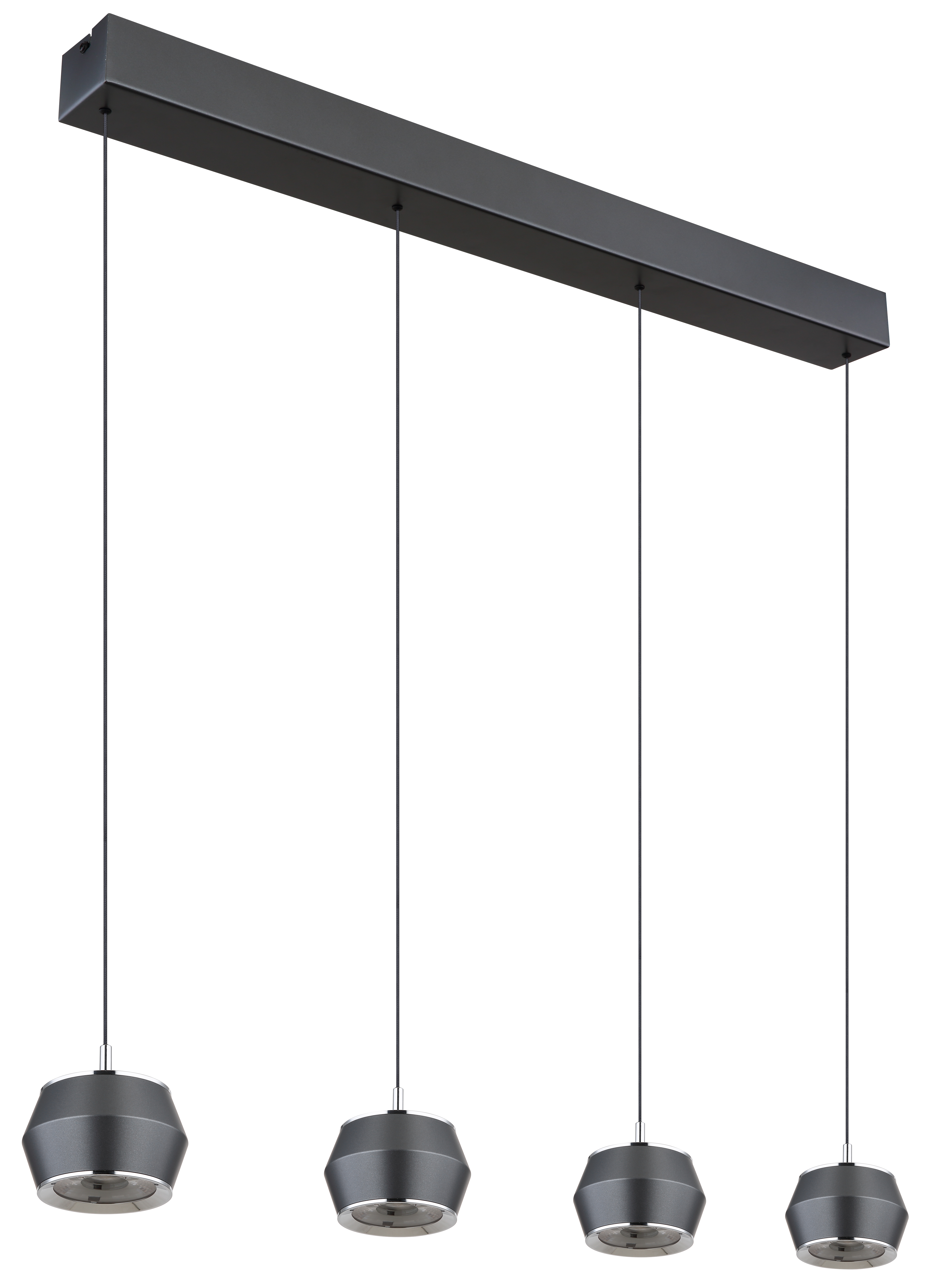 La lampada a sospensione è realizzata in metallo grigio opaco e alluminio color titanio spazzolato e acrilico opalino, disposti in un diametro di 805 mm x 100 mm x 2000 mm (lunghezza x larghezza x altezza). L'apparecchio viene fornito con una lampadina a LED con una potenza di 24 W e una tensione di 230 V. La sorgente luminosa ha una luminosità di 2900 lm e una potenza di uscita di 1000 lm ad una temperatura di colore di 3000K.