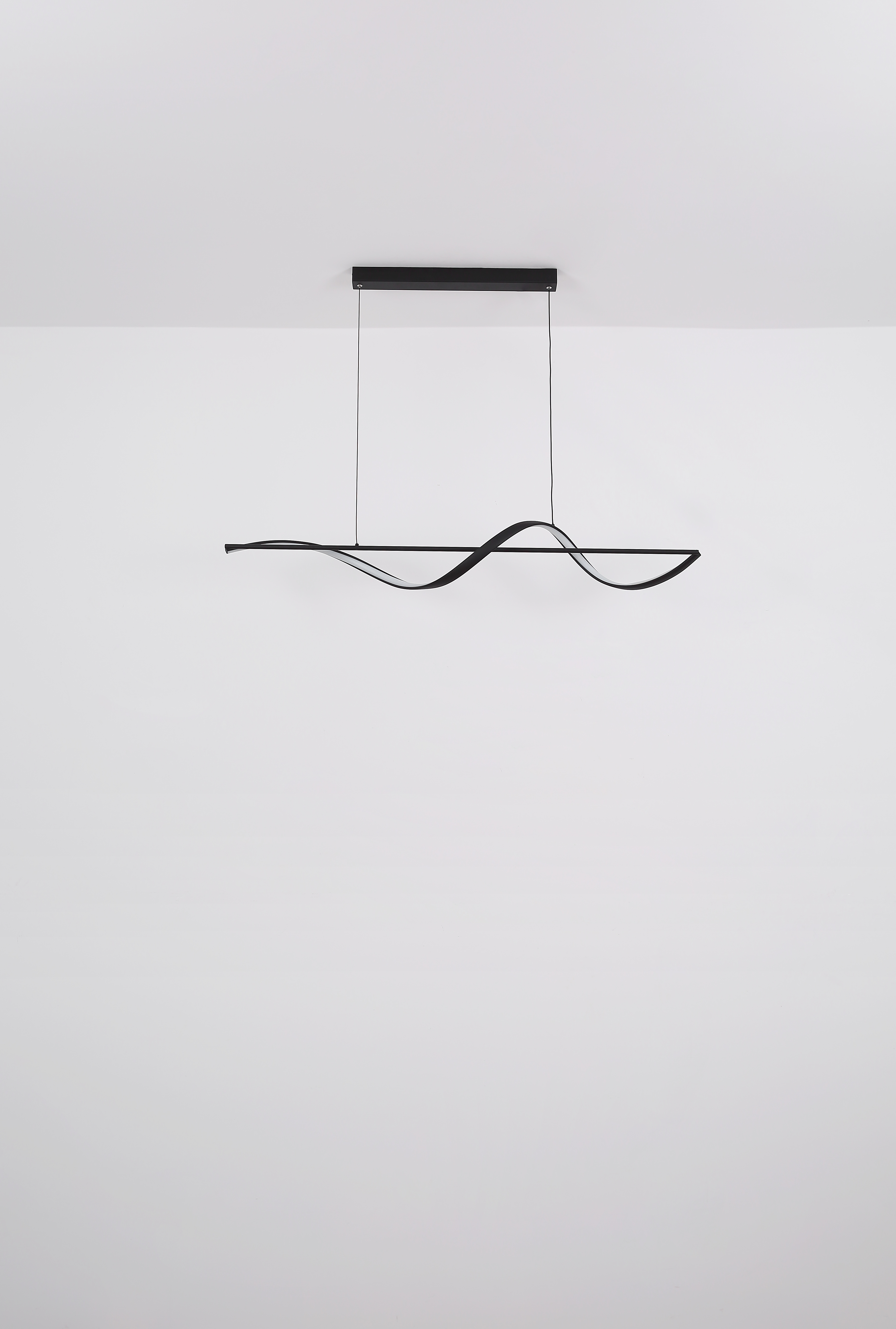 La lampada a sospensione è realizzata in metallo nero opaco e alluminio nero opaco e silicone opalino, disposte in un diametro di 1200 mm x 200 mm x 1500 mm (lunghezza x larghezza x altezza). Il cavo in PVC nero è regolabile in altezza e può essere accorciato individualmente per adattarsi in modo ottimale all'altezza della stanza. L'apparecchio viene fornito con una lampadina a LED con una potenza di 24 W e una tensione di 230 V. La sorgente luminosa ha una luminosità di 3000 lm e una potenza di uscita di 1000 lm ad una temperatura di colore di 3000K. Questa lampada a sospensione è un vero e proprio eye-catcher ed è ideale per gli spazi abitativi moderni. La combinazione di metallo nero opaco, alluminio nero opaco e silicone opalino conferisce alla lampada un aspetto elegante. La regolazione in altezza consente di adattare l'apparecchio alle proprie esigenze. Con la lampada a LED, risparmi energia e proteggi l'ambiente.