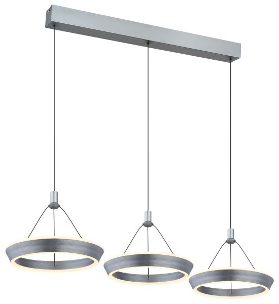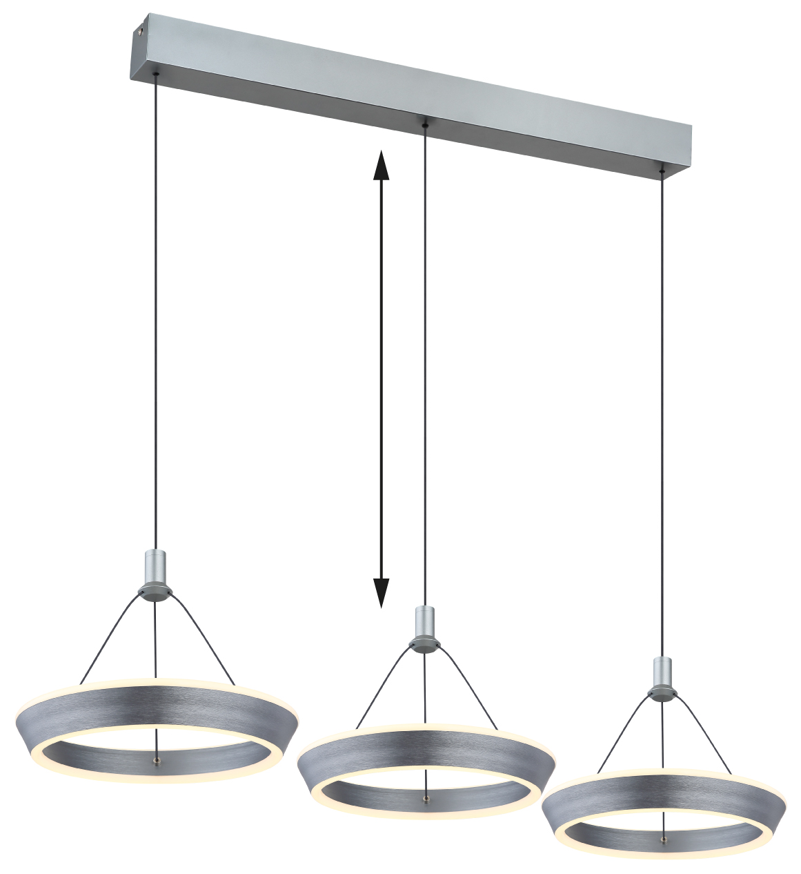 La lampada a sospensione è realizzata in metallo grigio opaco e alluminio spazzolato color titanio e silicone opalino, disposte in un diametro di 975 mm x 304 mm x 2000 mm (lunghezza x larghezza x altezza). La lampada viene fornita con una lampadina a LED con una potenza di 36 W e una tensione di 230 V. La sorgente luminosa ha una luminosità di 4500 lm e una potenza di uscita di 1000 lm ad una temperatura di colore di 3000K. Questa lampada a sospensione è un vero e proprio eye-catcher ed è ideale per gli spazi abitativi moderni. La combinazione di metallo grigio opaco, alluminio titanio spazzolato e silicone opalino conferisce alla lampada un aspetto elegante. La regolazione in altezza consente di adattare l'apparecchio alle proprie esigenze. La luce può essere diretta su e giù per creare una piacevole illuminazione. La luminosità della lampada a LED offre un'illuminazione piacevole che bagna la stanza in una luce calda. Con la lampada a LED, risparmi energia e proteggi l'ambiente.
