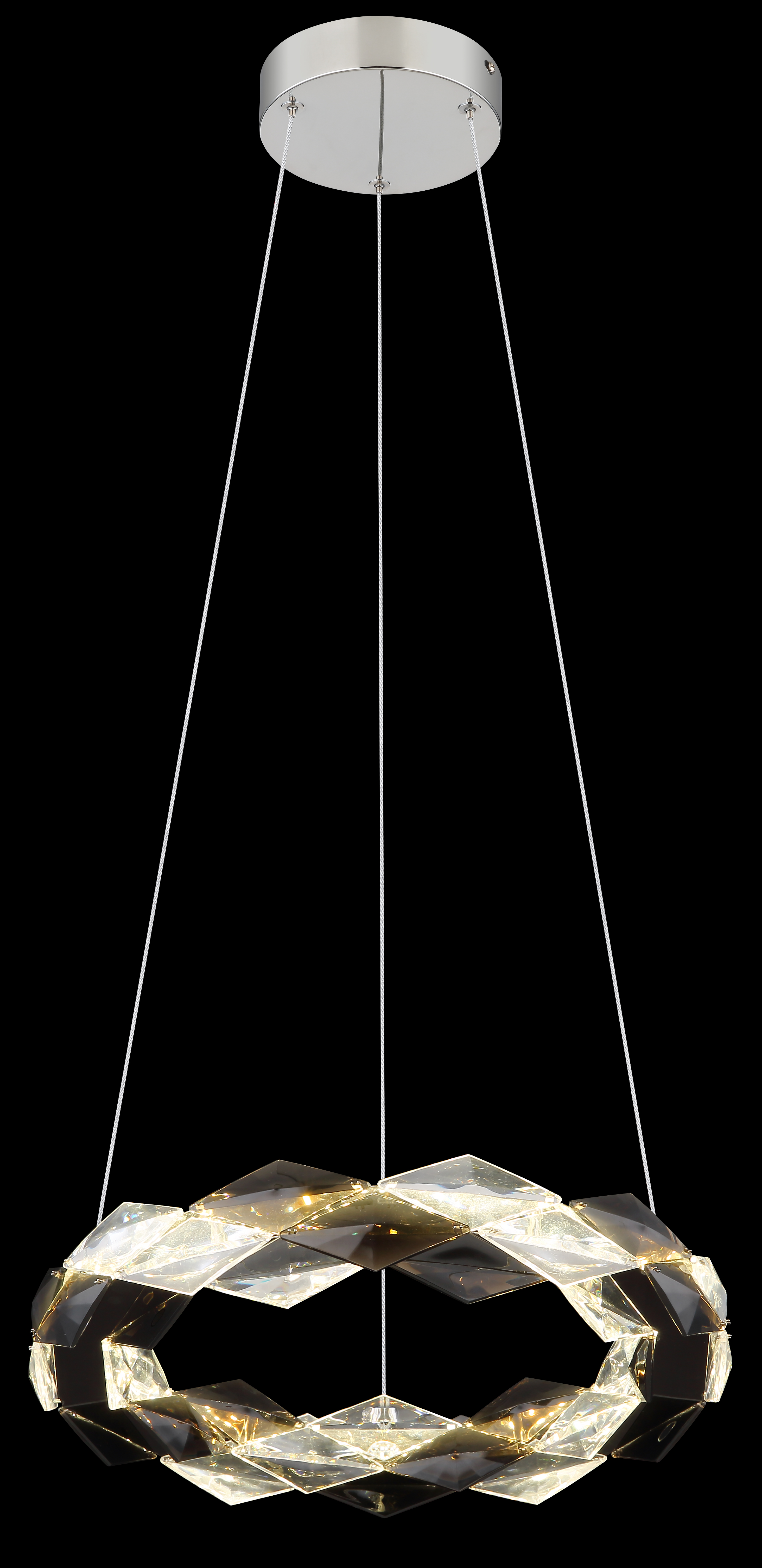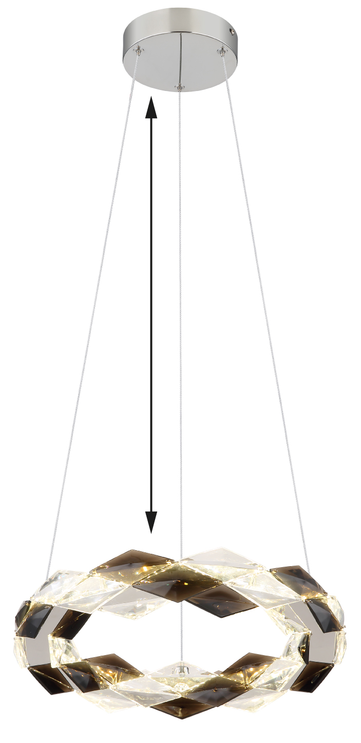 La lampada a sospensione ha un diametro di 370 mm e un'altezza di 1300 mm. È regolabile in altezza e realizzato in metallo cromato e cristalli acrilici color fumo. La lampada è alimentata da una lampada a LED con un consumo energetico di 24 watt, che produce una potenza luminosa di 2750 lumen (sorgente) e 840 lumen (effettiva) a una temperatura di colore di 4000 Kelvin 1.Questa lampada a sospensione è un vero colpo d'occhio ed è ideale per gli spazi abitativi moderni. La combinazione di metallo cromato e cristalli acrilici color fumo conferisce alla lampada un aspetto elegante che valorizza qualsiasi ambiente. La regolazione in altezza consente di adattare l'apparecchio alle proprie esigenze e posizionarlo in diversi punti della stanza. La lampada a LED fornisce un'illuminazione luminosa ed efficiente dal punto di vista energetico che bagna la stanza in una luce piacevole.