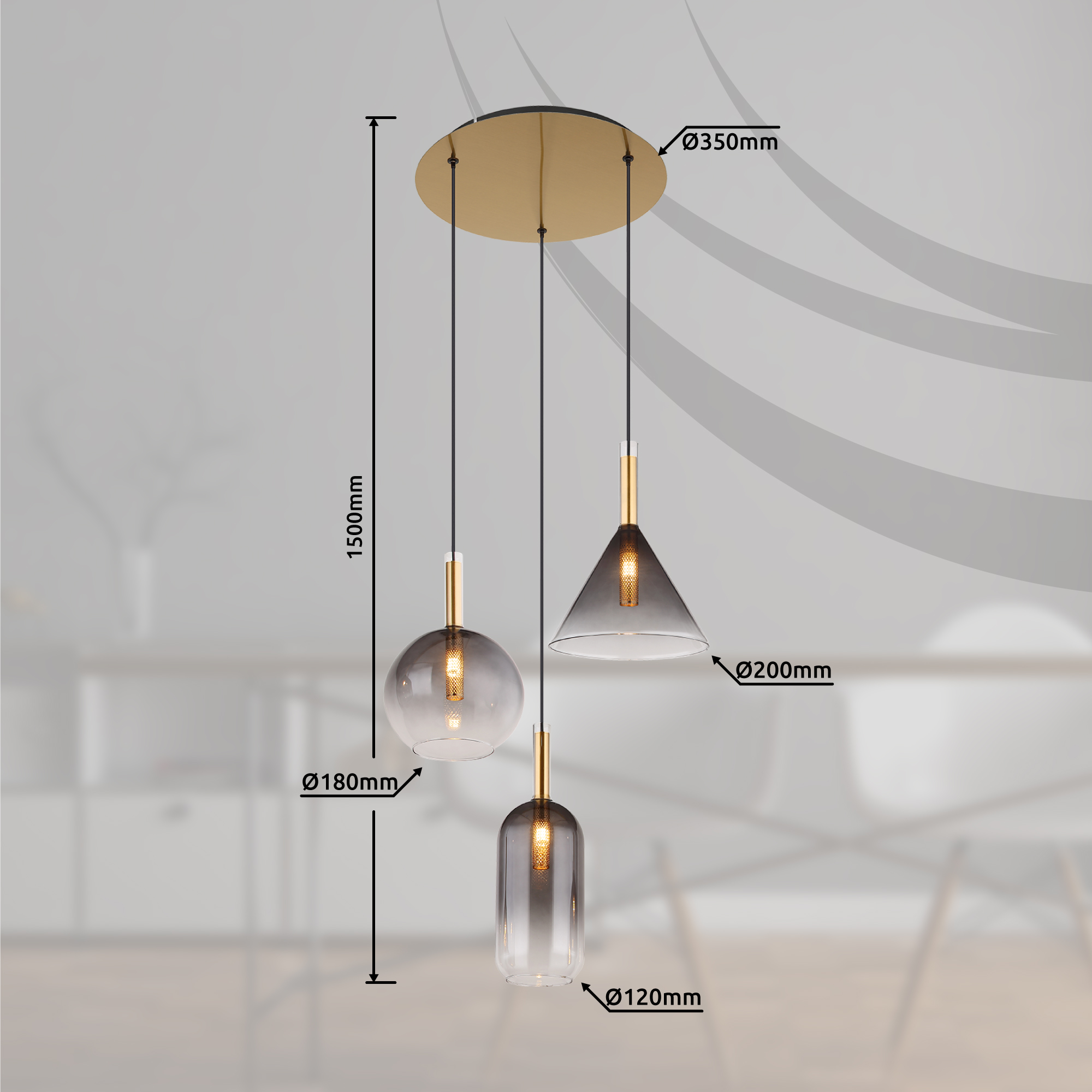 La lampada a sospensione di Globo Lighting è una scelta elegante e semplice per la tua casa. La lampada è realizzata in metallo di alta qualità in metallo nero opaco e ottone, così come il vetro in colore fumo, che ha una sfumatura chiara. Il cavo è nero e l'altezza dell'apparecchio può essere ridotta. Con un diametro di 430 mm e un'altezza di 1500 mm, questa lampada a sospensione è un vero e proprio colpo d'occhio in ogni stanza. La lampada è dotata di tre vetri con diametri di 12cm, 18cm e 20cm. L'apparecchio richiede tre lampadine LED G9, ciascuna con una potenza di 10W e una tensione di 230V, che non sono incluse.