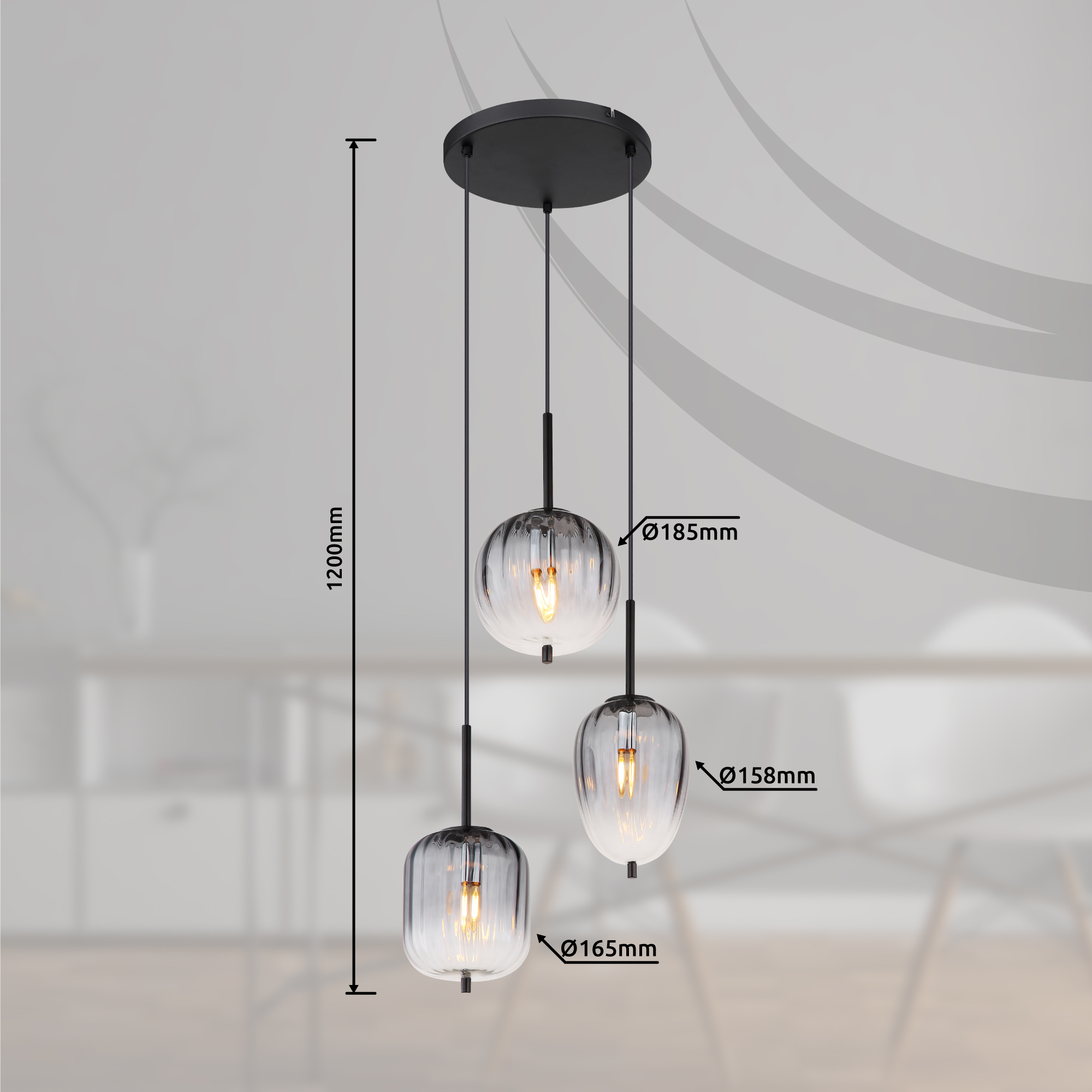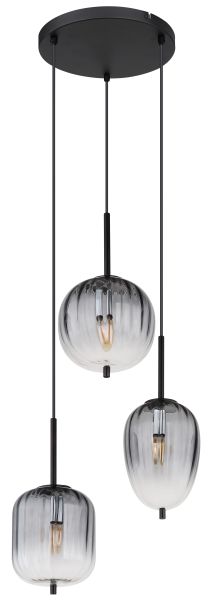 La lampada a sospensione ha un diametro di 460 mm e un'altezza di 1200 mm. È realizzato in nero, metallo opaco e vetro color fumo che ha un gradiente chiaro. Il cavo è nero e realizzato in PVC. Il diametro del vetro varia tra 15,8 cm, 16,5 cm e 18,5 cm. La lampada a sospensione è un elemento di illuminazione moderno ed elegante, perfetto per il soggiorno, la sala da pranzo o la camera da letto. Con il suo vetro color fumo e il gradiente chiaro, crea un'atmosfera piacevole in ogni stanza. La lampada a sospensione è facile da installare e può essere assemblata in pochi minuti.