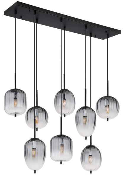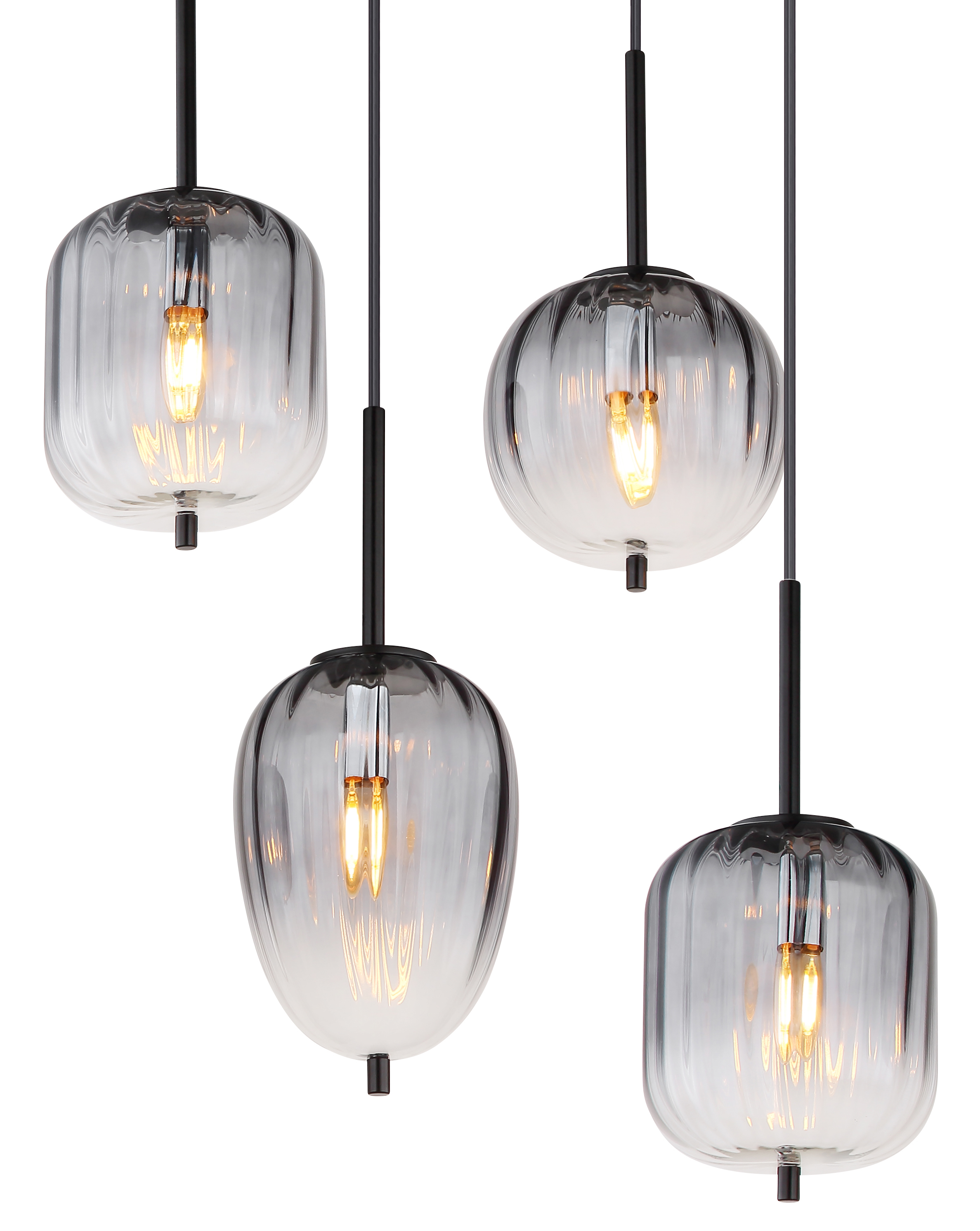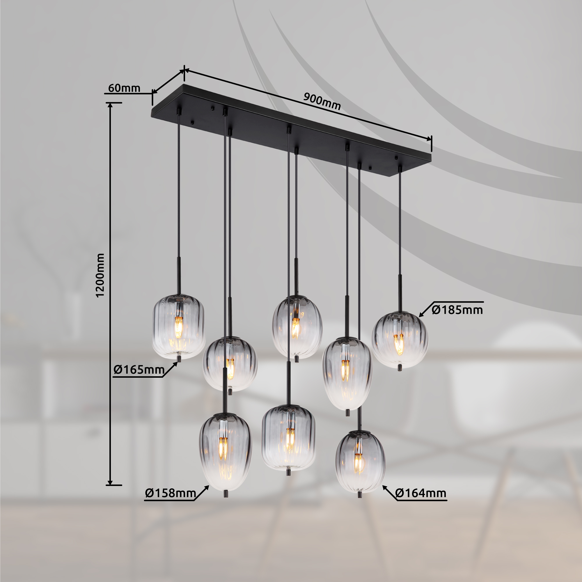 La lampada a sospensione ha una lunghezza di 1025 mm, una larghezza di 325 mm e un'altezza di 1200 mm. È realizzato in nero, metallo opaco e vetro color fumo che ha un gradiente chiaro. Il cavo è nero e realizzato in PVC. Il diametro del vetro varia tra 15,8 cm, 16,4 cm, 16,5 cm e 18,5 cm. La lampada a sospensione è un elemento di illuminazione moderno ed elegante, perfetto per il soggiorno, la sala da pranzo o la camera da letto. Con il suo vetro color fumo e il gradiente chiaro, crea un'atmosfera piacevole in ogni stanza. La lampada a sospensione è facile da installare e può essere assemblata in pochi minuti.