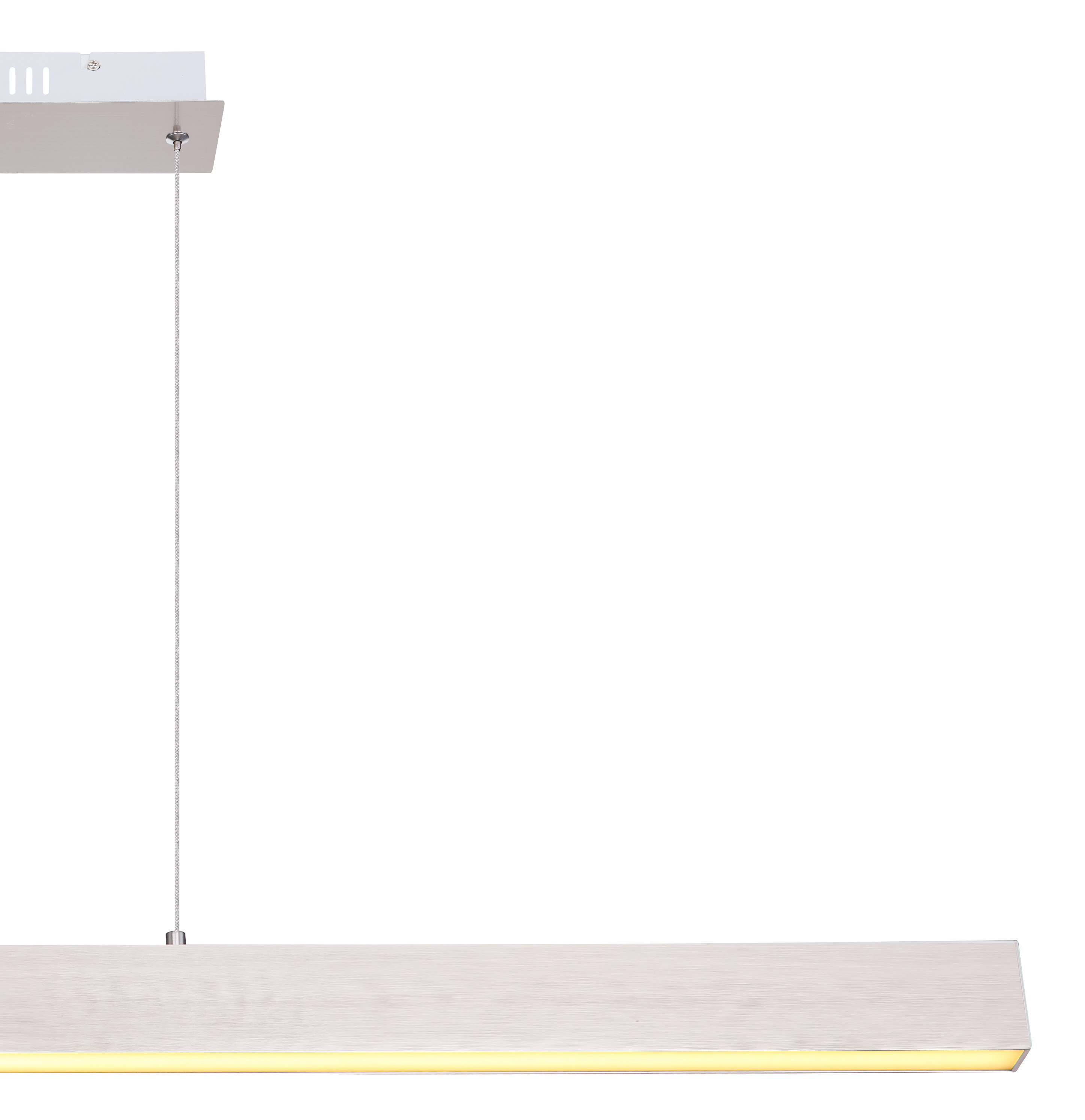 La sospensione in metallo con un paralume in plastica in bianco opalino immerge il soggiorno o la sala da pranzo in una luce bianca calda e accogliente grazie alle lampadine incluse (3000 Kelvin). Poiché la sospensione a forma di fascio può essere regolata in 3 fasi tramite l'interruttore a muro, è possibile regolare l'atmosfera della stanza a proprio piacimento. La sospensione ha una funzione di memoria e ricorda l'ultimo valore impostato. La barra stretta di 8 cm diventa un eye-catcher sopra il tavolo da pranzo o soggiorno grazie alla sua lunghezza di 121 cm.