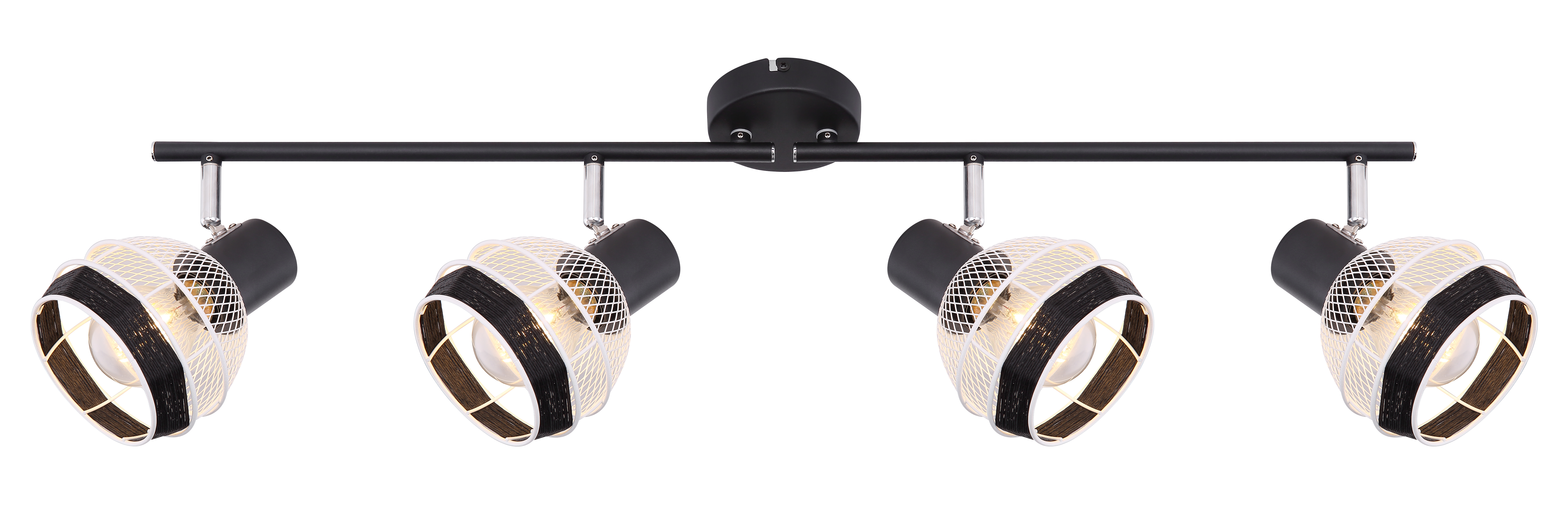 Questa interessante serie GRIDDY combina diversi materiali - il metallo nero opaco o bianco con la corda di canapa di colore nero. I quattro faretti su due bracci convincono per il design dei paralumi, che sono trecce di metallo e sono circondati da una corda di canapa nera nella parte anteriore. Con la libera scelta della lampadina (4xE27/max. 40W) si può scegliere liberamente l'intensità luminosa e il colore della luce di questa lampada per interni. A causa della loro longevità e del risparmio energetico, raccomandiamo l'uso di lampadine a LED. Questa lampada a faretti è adatta a camere da letto, corridoi, soggiorni e sale da pranzo.