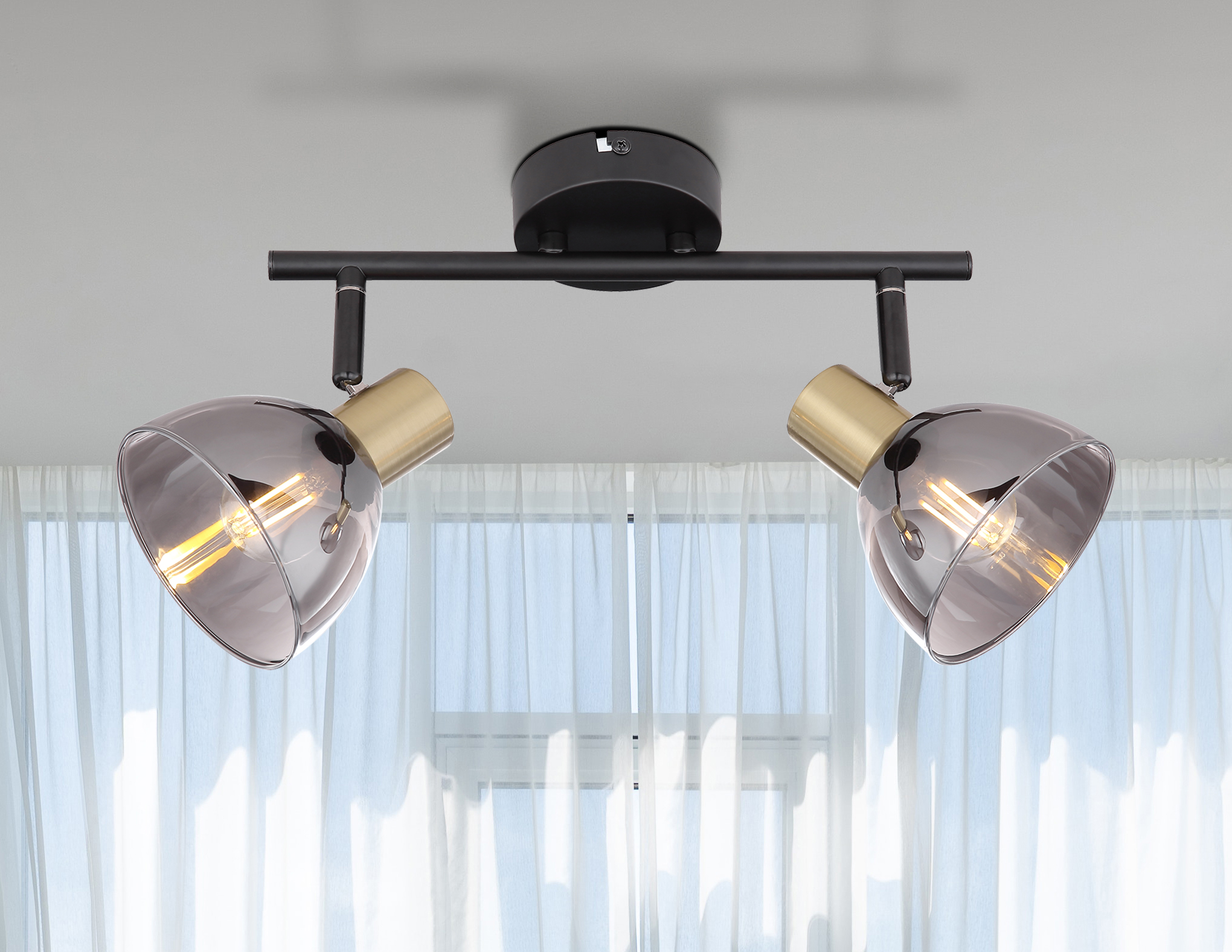 L'elegante faretto nero colpisce per la varietà di materiali diversi e diversamente lavorati. Il metallo nero costituisce il fissaggio alla parete, mentre i due portalampade E14 fissati ad una guida metallica sono racchiusi da due gusci di ottone opaco. Le lenti color fumo di questo apparecchio di 30 cm di lunghezza completano il quadro. La libera scelta delle lampadine (2x E14/max. 25W) consente di determinare autonomamente l'intensità e il colore della luce di questa lampada per interni. A causa della loro longevità e del risparmio energetico, raccomandiamo l'uso di lampadine a LED. Con altri modelli di questa serie è possibile abbellire ulteriormente ogni spazio abitativo.