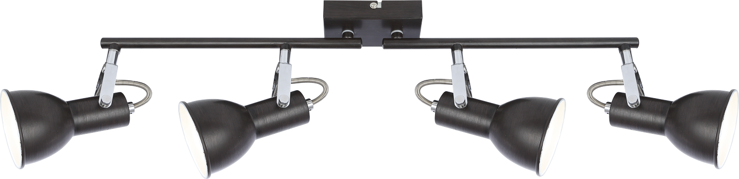 Il colore marrone (colore interno del punto: bianco), il punto metallico del soffitto Fargo offre quattro punti regolabili su due bracci mobili. Le prese E14 possono essere equipaggiate a piacere, ma con un massimo di 40W. I LED sono ideali per questo scopo grazie al loro risparmio energetico e alla loro lunga durata. Ulteriori punti a parete e a soffitto della stessa serie di prodotti potrebbero completare l'immagine in ogni zona giorno.