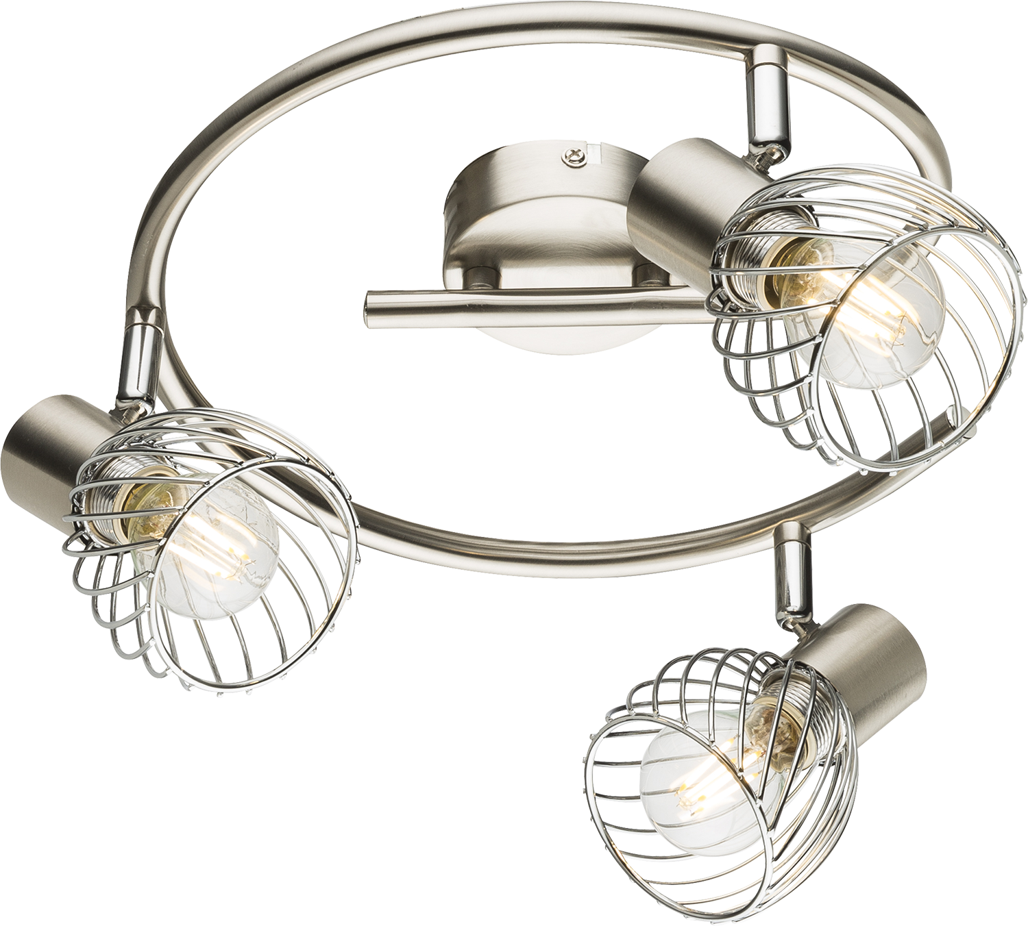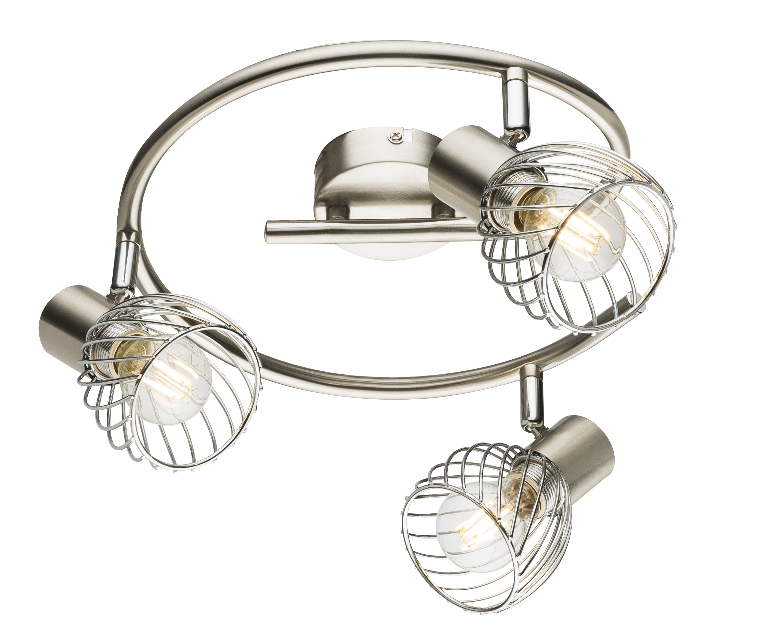 Il faretto da soffitto di questa serie di prodotti convince per la combinazione di design e lavorazione. La combinazione di materiali di metallo nichel opaco e di paralumi a gabbia metallica fornisce quel qualcosa di speciale. I tre faretti mobili, fissati ad un braccio a forma di E, sono dotati ciascuno di una presa E14, che permette di scegliere la lampadina da soli (max.40W) per decidere l'intensità e il colore della luce. Grazie al loro risparmio energetico e alla loro lunga durata, raccomandiamo le lampadine a LED. Con altre plafoniere della stessa serie di prodotti si potrà completare il quadro in ogni stanza.