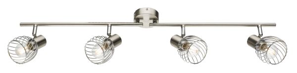Il faretto da soffitto di questa serie di prodotti convince per la combinazione di design e lavorazione. La combinazione di materiali di metallo nichel opaco e di paralumi a gabbia metallica fornisce quel qualcosa di speciale. I quattro spot, fissi e mobili su due bracci rettilinei, sono dotati ciascuno di una presa E14, che permette di scegliere la lampadina da soli (max.40W) per decidere l'intensità e il colore della luce. Grazie al loro risparmio energetico e alla loro lunga durata, raccomandiamo le lampadine a LED. Con altre plafoniere della stessa serie di prodotti si potrà completare il quadro in ogni stanza.