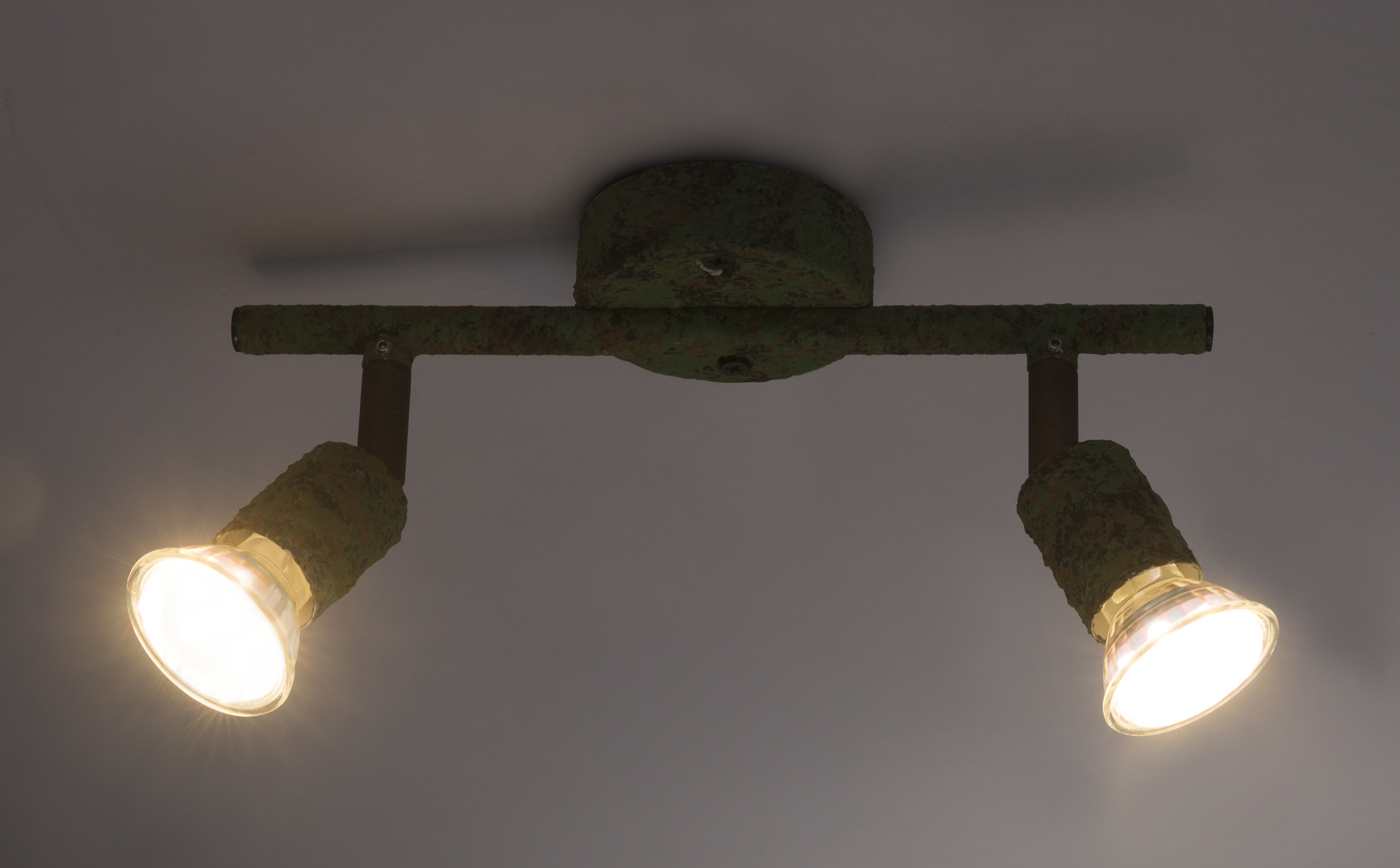 Il doppio faretto della serie Olana si distingue per il suo design individuale. Realizzato in metallo verde arrugginito, questo faretto dà un tocco speciale ai vostri locali. I due spot mobili, fissati a un braccio fisso dritto, sono dotati ciascuno di una lampadina LED GU10 da 3W che fornisce 500 lumen di luce forte con un piacevole colore bianco caldo a 3000K. Con altri faretti della stessa serie di modelli è possibile completare il quadro dei vostri locali.