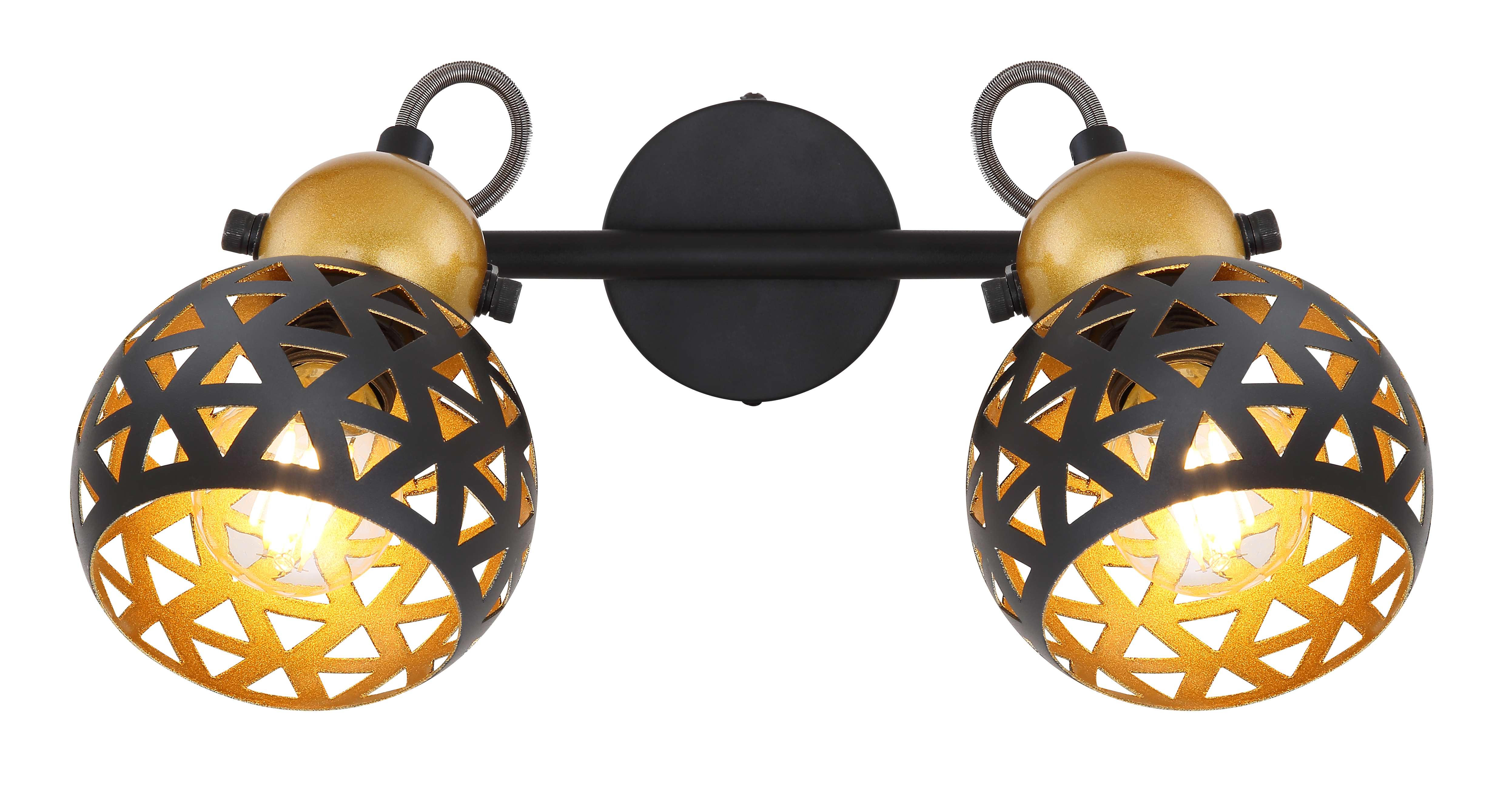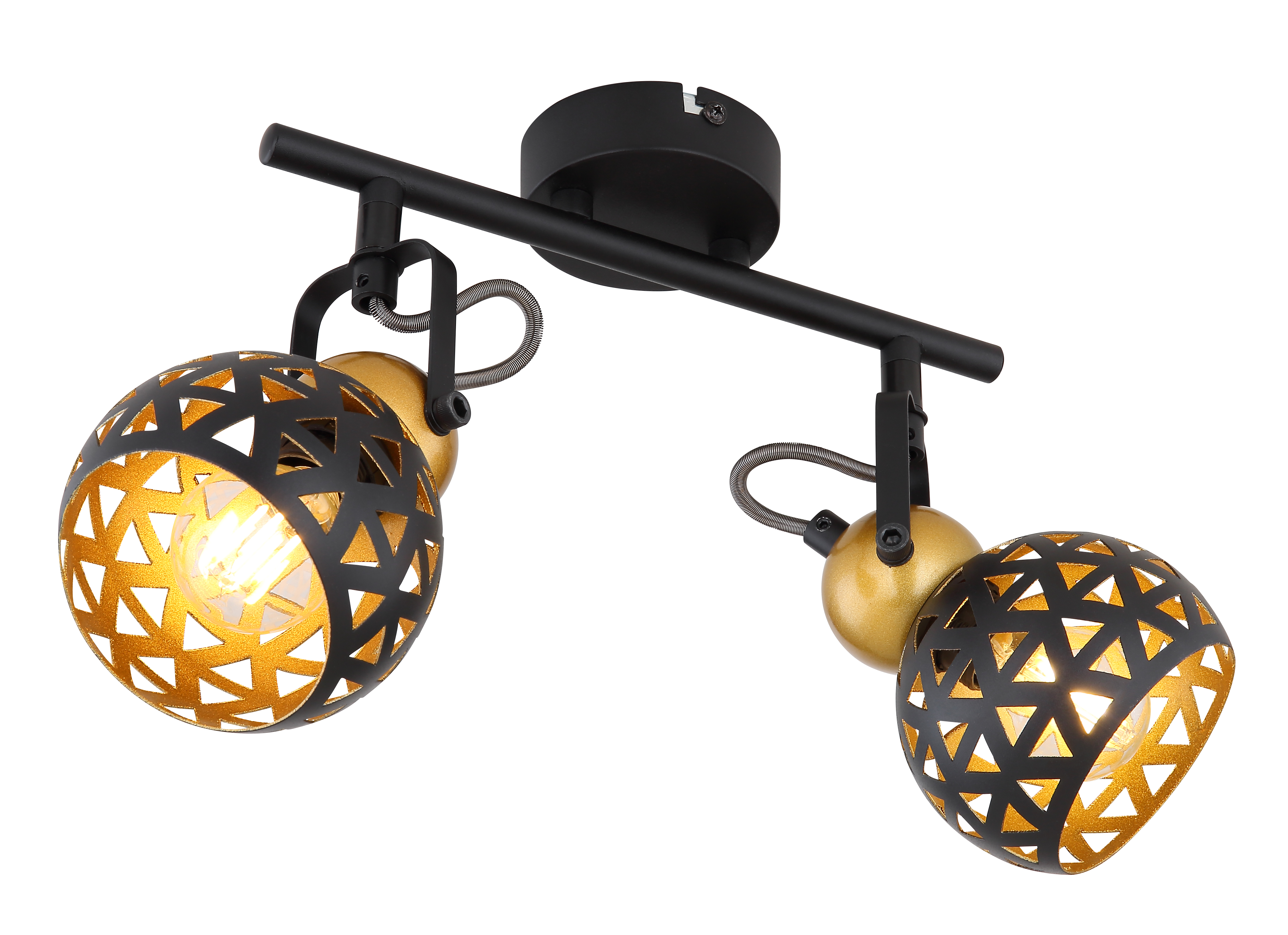 Con questo faretto doppio da 25 cm di lunghezza della serie Sarra, si può mettere elegantemente in scena i propri interni. Le due prese E14 girevoli coperte da una cupola di metallo color oro sono fissate a un'asta di metallo per mezzo di staffe nere e possono essere dotate di una lampadina abbinata di propria preferenza. Questo dà la possibilità di determinare il colore della luce e la luminosità secondo i propri desideri. Inoltre, un bel motivo è proiettato dalle due tonalità di metallo nero e dorato all'interno con numerose punzonature triangolari, permettendo a ciascuno di porre accenti di stile nelle proprie stanze.