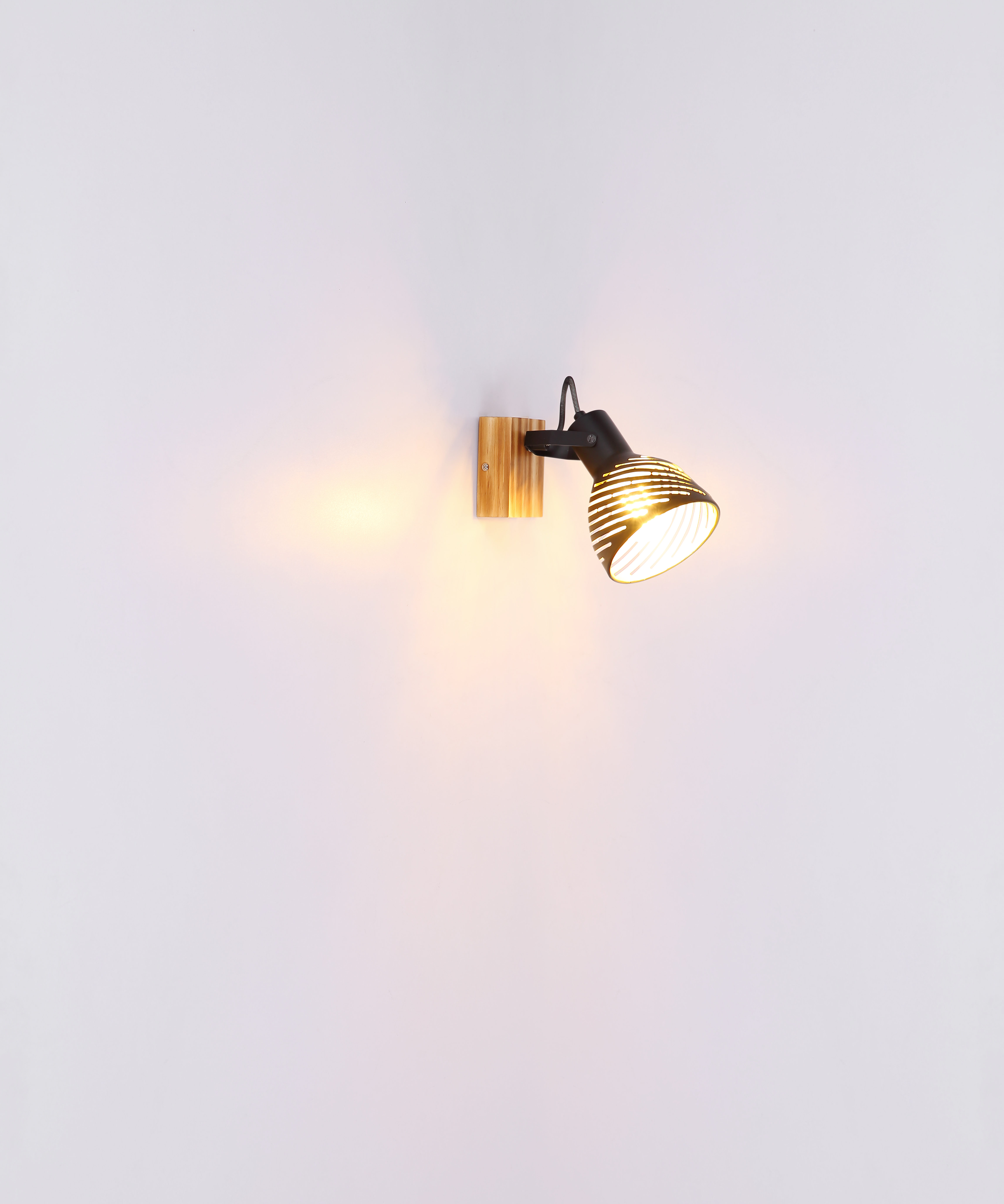 Questo faretto della serie Lenna si fonde meravigliosamente con l'ambiente di una vasta gamma di stili di vita grazie al suo design elegante in legno marrone scuro e metallo nero. Il paralume orientabile in metallo con motivo a linee è dorato all'interno e montato sul legno marrone scuro (12,5x13 cm) per mezzo di una staffa. Inoltre, può essere montato con una lampadina E27 di propria preferenza, permettendo a ciascuno di determinare individualmente il colore della luce e la luminosità. Con altri modelli della stessa serie, si può completare il quadro generale all'interno delle stanze.