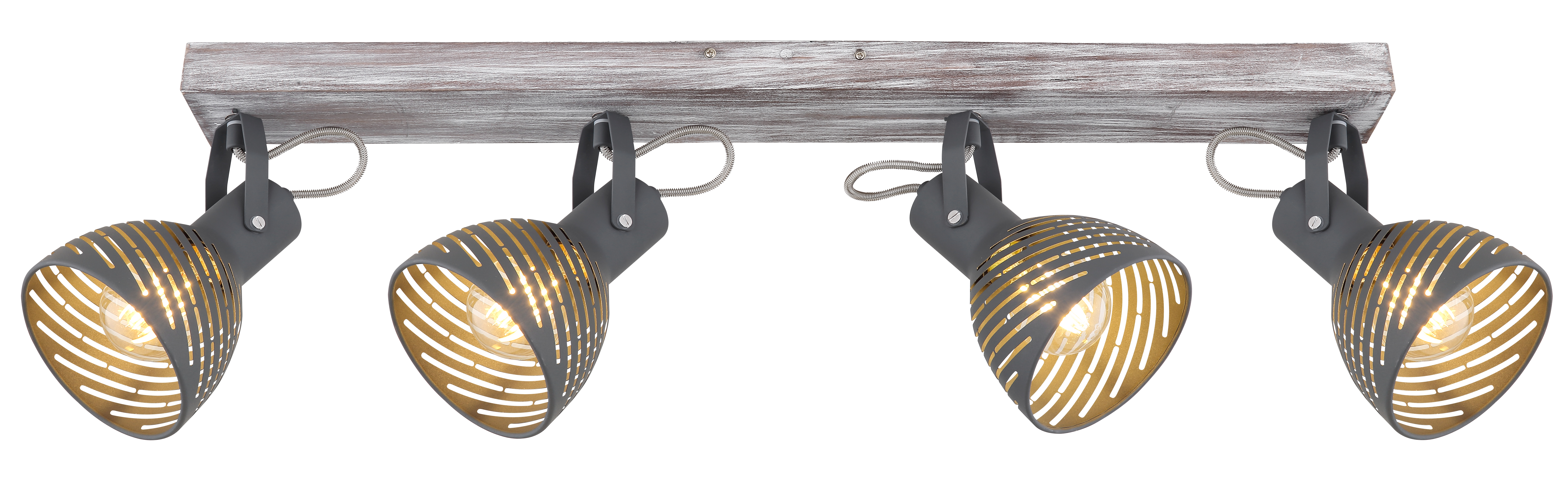 Questo faretto da soffitto della serie Mori (80x12,5 cm) si adatta meravigliosamente all'ambiente di diversi stili di vita. Consiste in una trave di legno imbiancata, che è dotata di quattro tonalità metalliche grigie girevoli con perforazioni a forma di linea. Questi possono essere montati con lampadine E27 di propria preferenza, dando la possibilità di determinare individualmente il colore della luce e la luminosità. Con altri modelli della stessa serie, si può completare il quadro generale nelle proprie stanze.
