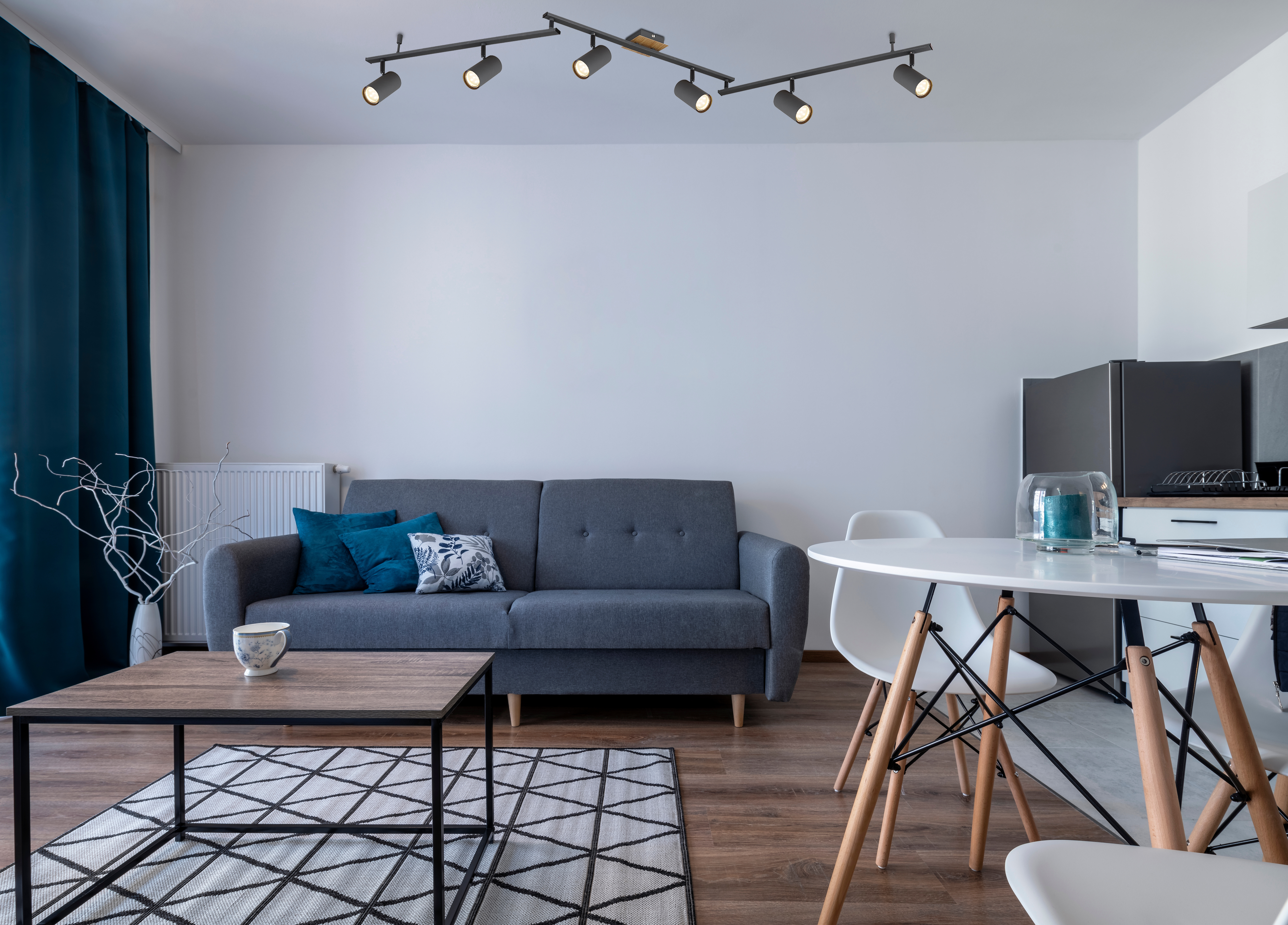 Questo faretto da soffitto della serie Robby (180x10 cm) convince per il suo elegante design in metallo color grafite. Consiste in tre aste di metallo, a ciascuna delle quali sono fissate due prese GU10 girevoli incassate nel metallo. Questi possono essere dotati di fonti di luce adeguate di propria preferenza, dando la possibilità di determinare il colore della luce e la luminosità secondo le proprie preferenze. Con altri articoli della stessa serie, si possono aggiornare con stile i propri interni.