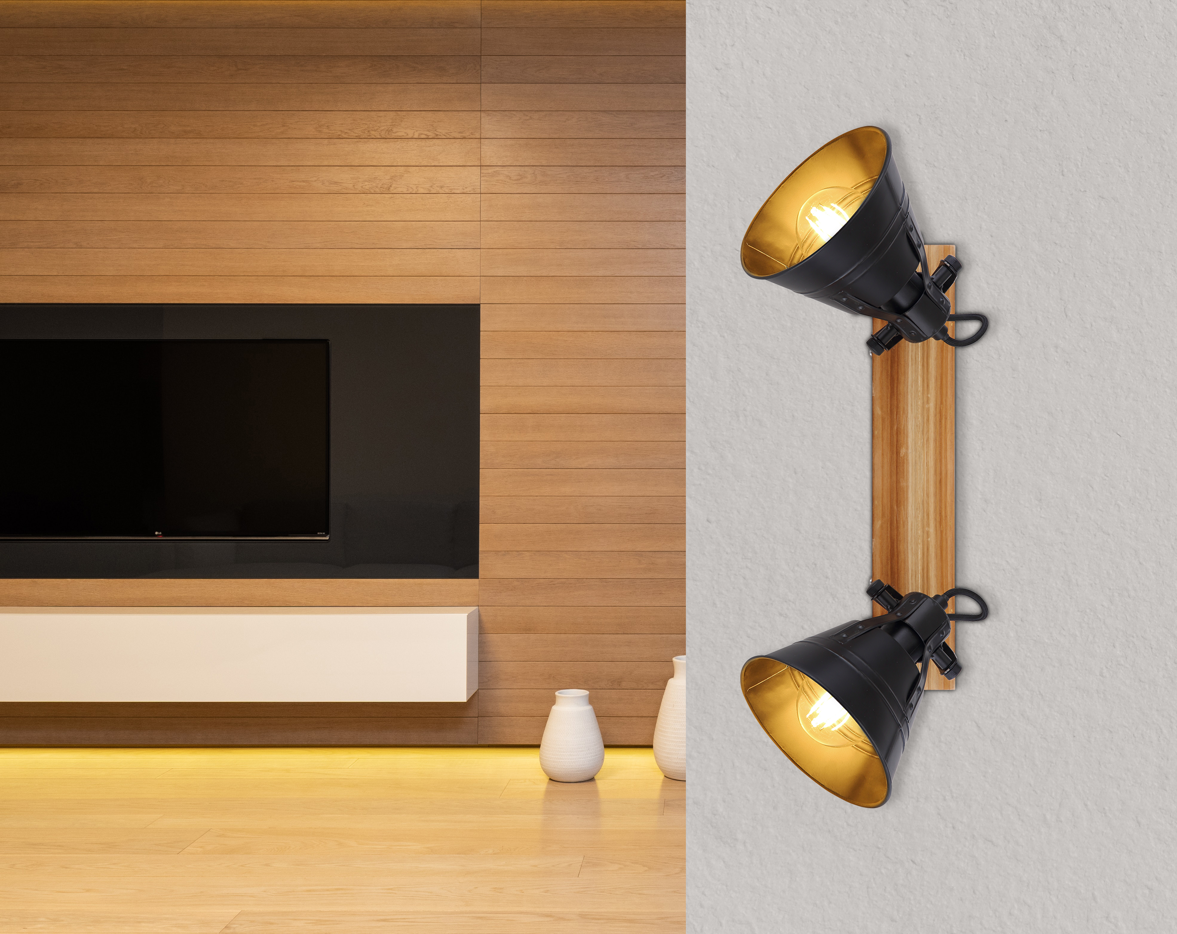 Il design industriale incontra l'eleganza. Il faretto a due lampade "GÜNTHER" è composto da una staffa da parete in legno e da due paralumi in metallo nero opaco che brillano all'interno in una grande tonalità dorata (L: 38cm, H: 24cm). La presa E27 può essere equipaggiata con lampadine di propria scelta e si può decidere quale colore di luce e intensità luminosa è perfetta per te (max. 60Watt). Inoltre, si può abbellire ogni casa con altri grandi prodotti di questa serie.