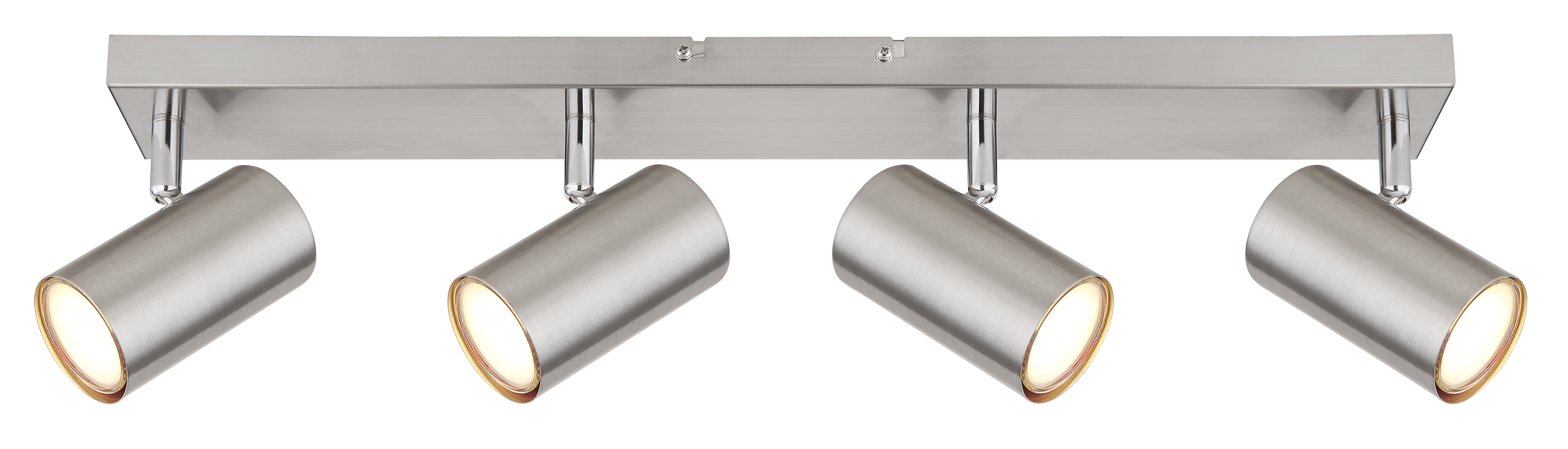 Questo semplice faretto della serie Robby ispira per design e colore. Su una staffa da soffitto rettangolare in nichel (56x6 cm) si trovano quattro prese GU10, ciascuna coperta da un paralume cilindrico. L'attacco GU10 consente di scegliere liberamente le lampadine, fino a una potenza massima di 35 watt.