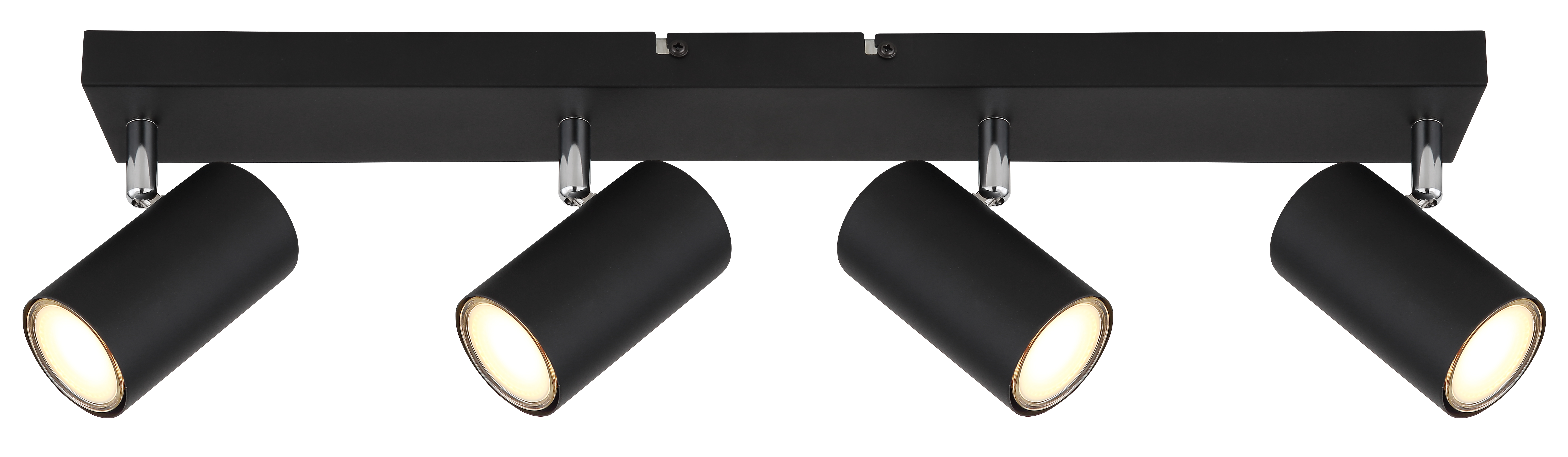 Questo semplice faretto della serie Robby ispira per design e colore. Su una staffa da soffitto rettangolare nera (56x6 cm) si trovano quattro prese GU10, ciascuna coperta da un paralume cilindrico in nero opaco. L'attacco GU10 consente di scegliere liberamente le lampadine, fino a una potenza massima di 35 watt.