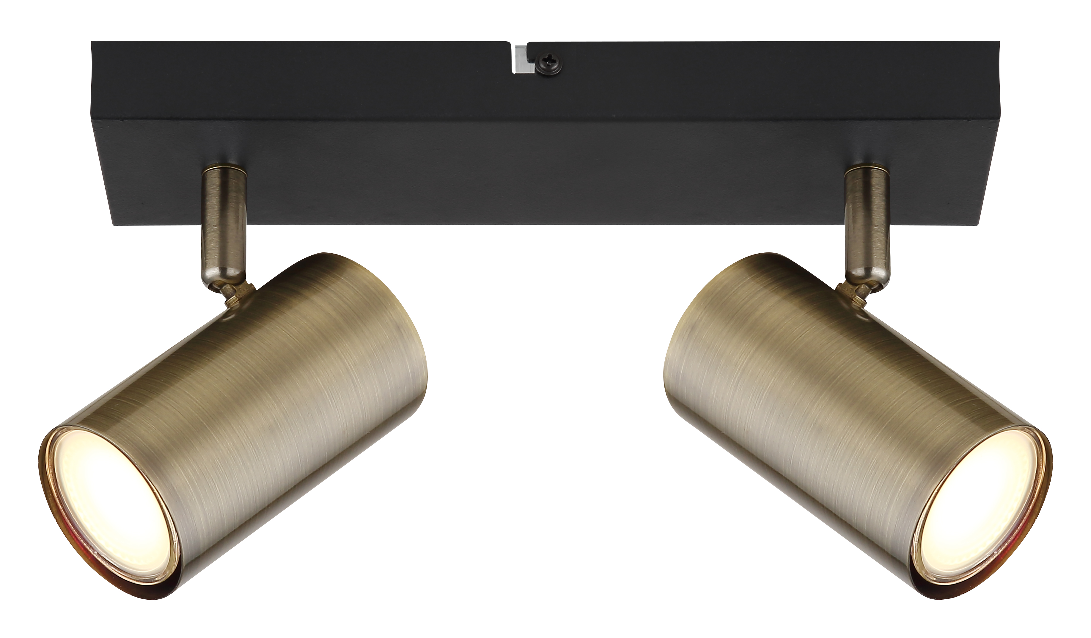 Questo semplice faretto della serie Robby ispira per il design e i colori. Su una staffa da soffitto rettangolare (26x6 cm) in nero opaco si trovano due prese GU10, ciascuna coperta da un paralume cilindrico nel colore ottone vecchio. L'attacco GU10 permette di scegliere liberamente le lampadine, fino a una potenza massima di 35 Watt.
