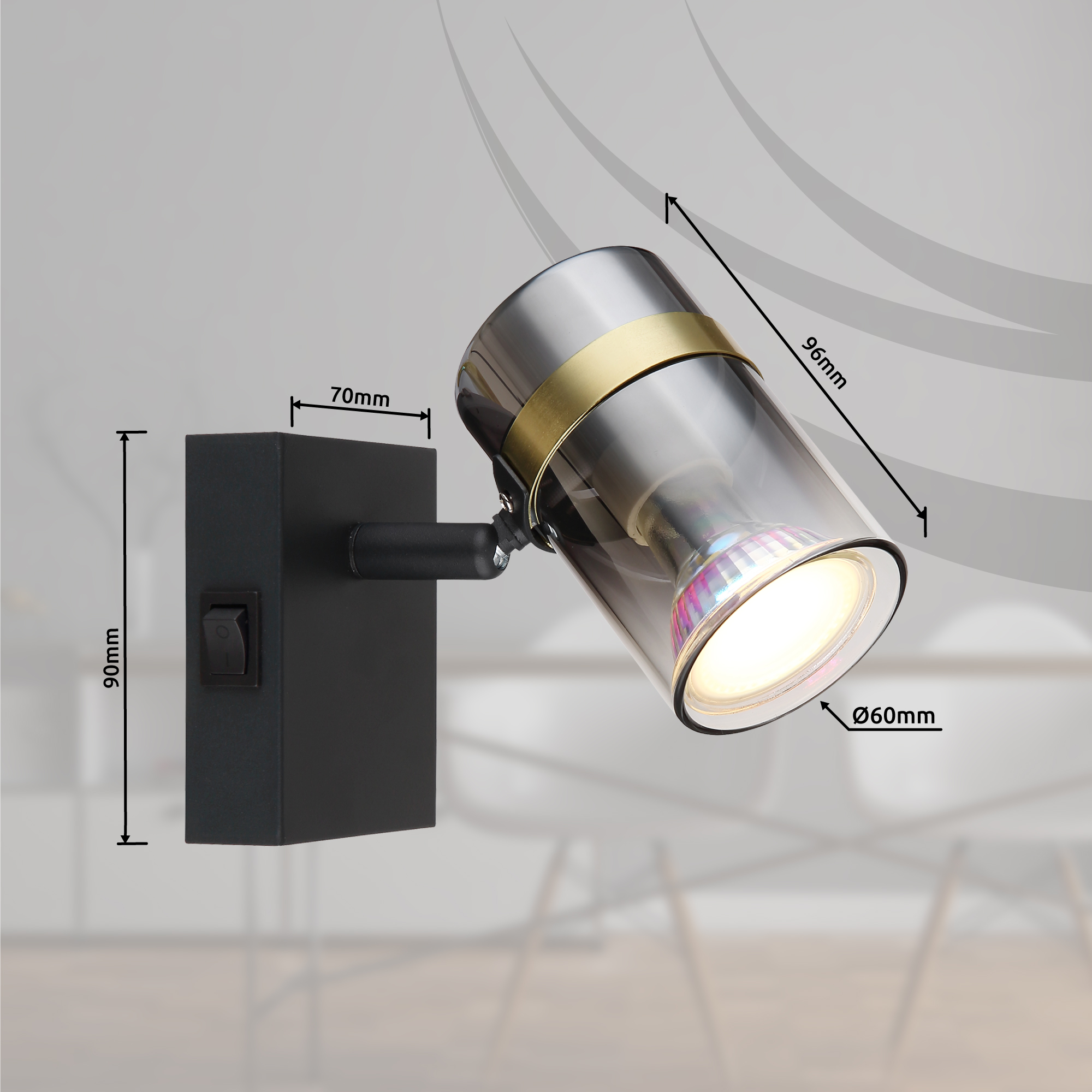 Scopri l'eleganza moderna di TRABBY! I nostri faretti in metallo nero opaco e vetro trasparente color fumo attirano l'attenzione in ogni stanza. L'accento in metallo opaco ottone aggiunge un tocco di raffinatezza a TRABBY. Con dimensioni di 70x96mm (larghezza x altezza) e una lunghezza di 125mm, il faretto TRABBY si adatta perfettamente al tuo interno. Il pratico interruttore a bilanciere sull'articolo consente di azionarlo facilmente. La presa GU10 consente di determinare autonomamente il colore della luce e la luminosità fino a una potenza massima di 8 watt. Prendi subito TRABBY e imposta accenti impressionanti nella tua casa con un'illuminazione elegante!