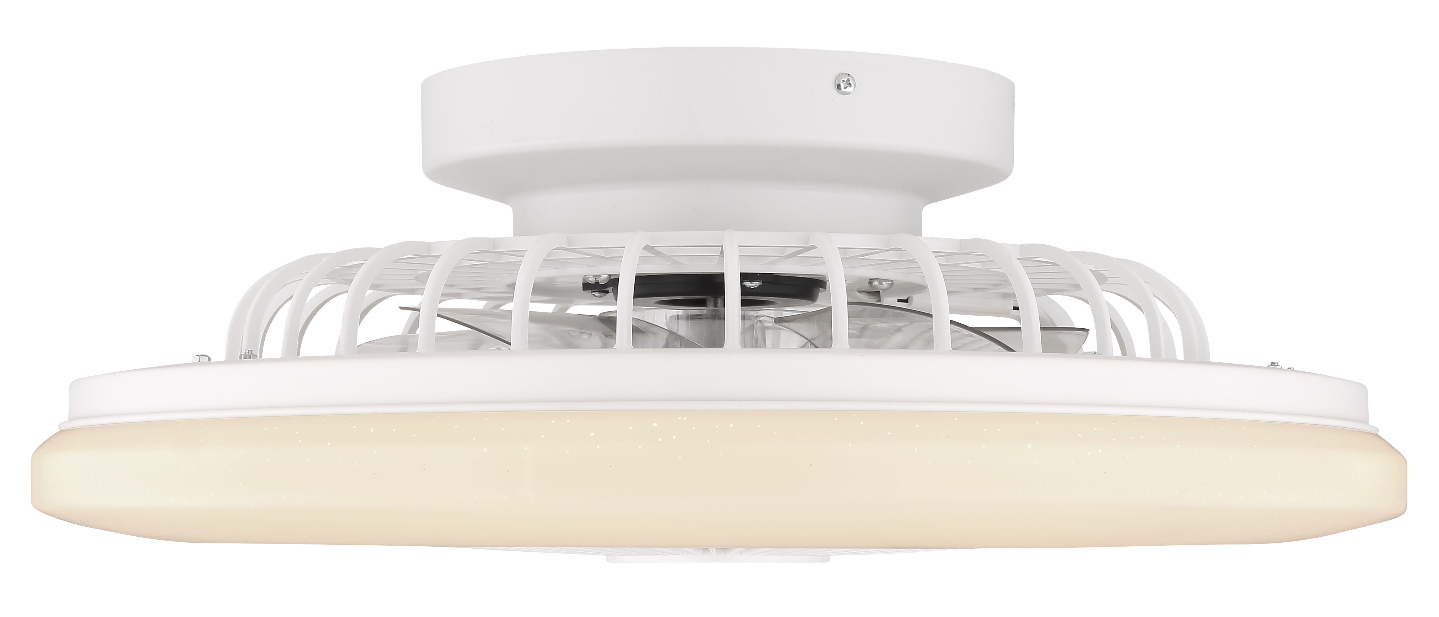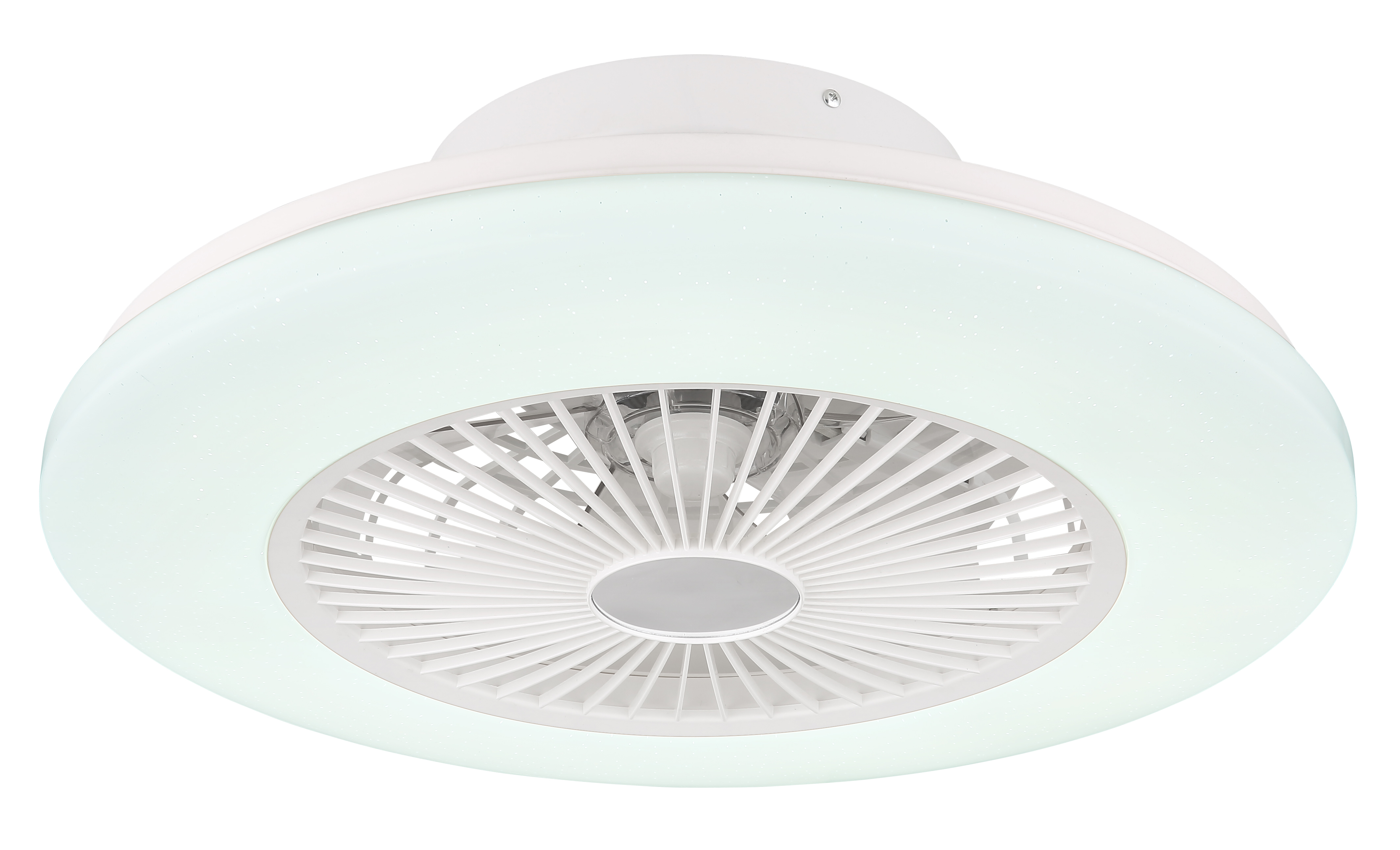 Ventilatore da soffitto TRAVO: comfort elegante per la tua casa Il ventilatore da soffitto TRAVO combina un design moderno con funzionalità versatili. Con il suo corpo rotondo in metallo bianco e plastica e un elegante paralume in acrilico con finitura opale ed effetto scintillante, si inserisce armoniosamente in qualsiasi ambiente abitativo. Le ali sono posizionate discretamente all'interno, creando un aspetto minimalista. Dotata di potente illuminazione LED, la ventola offre una luminosità di 2600 lumen e una funzione CCT che consente temperature di colore da 3000K a 6500K. La funzione di memoria integrata salva le tue impostazioni preferite, mentre la luce notturna crea un'atmosfera piacevole. Si controlla facilmente utilizzando il telecomando incluso. Puoi regolare i colori della luce, attenuare la luminosità e utilizzare il timer specifico per la ventola. Con un diametro di 500 mm TRAVO è ideale per soggiorni o camere da letto. Sperimenta una circolazione dell'aria elegante e un'illuminazione perfetta - con il ventilatore da soffitto TRAVO!
